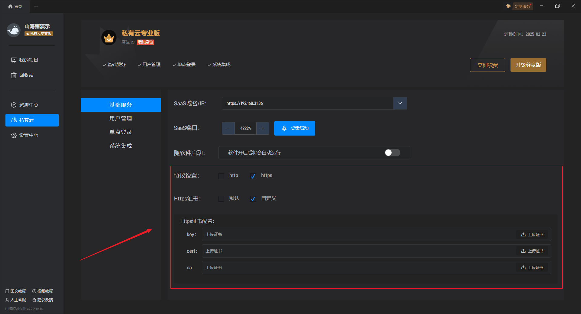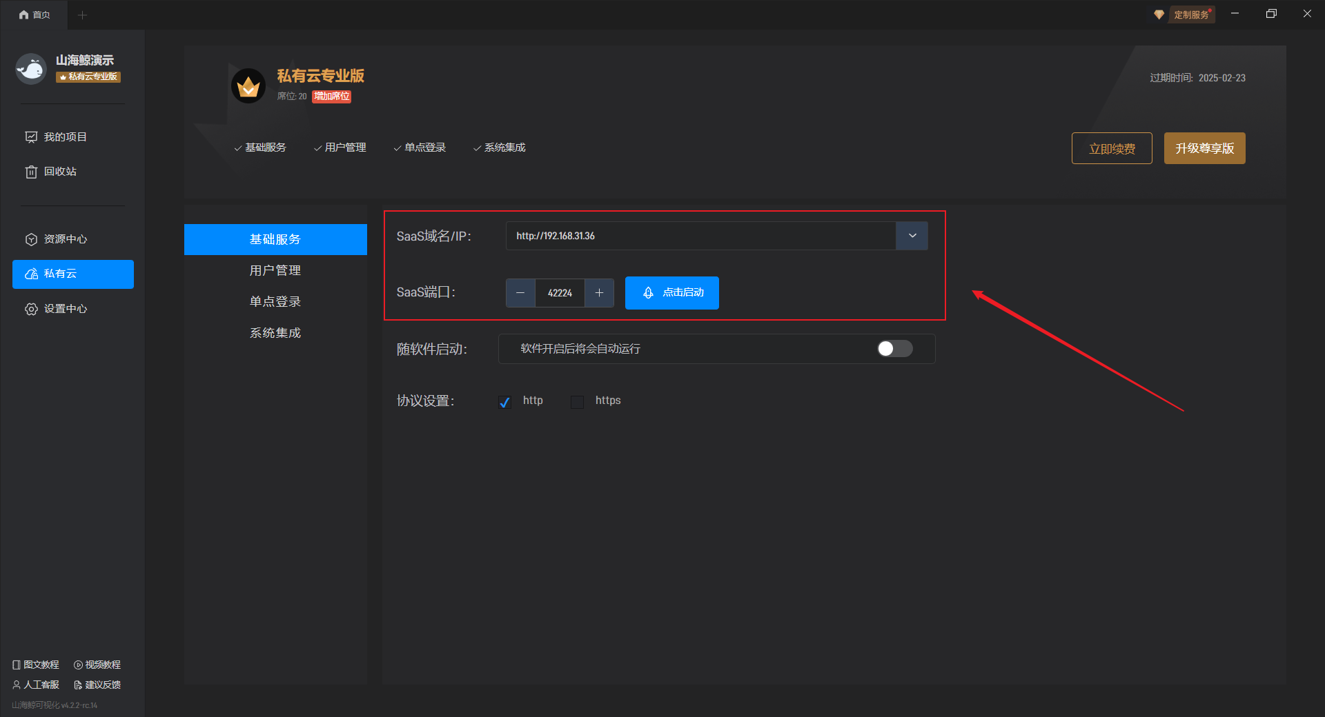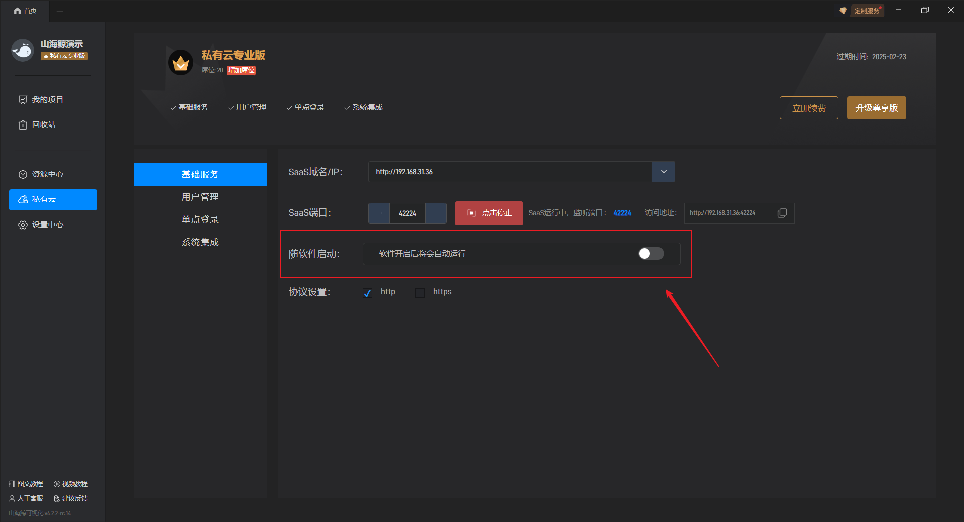 开启“随软件启动”按钮后,每次重新打开软件都会自动开启山海鲸 SaaS 服务。