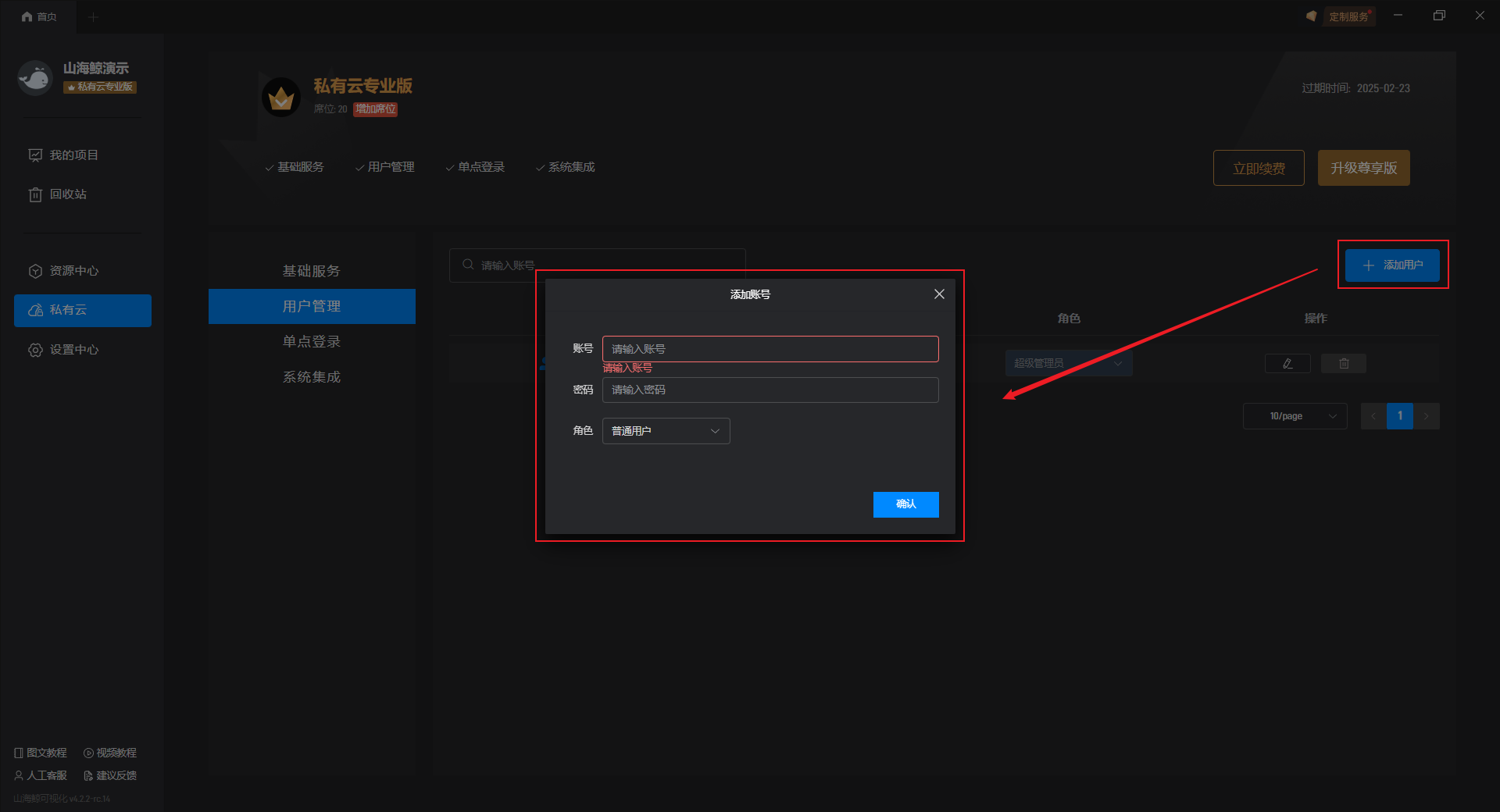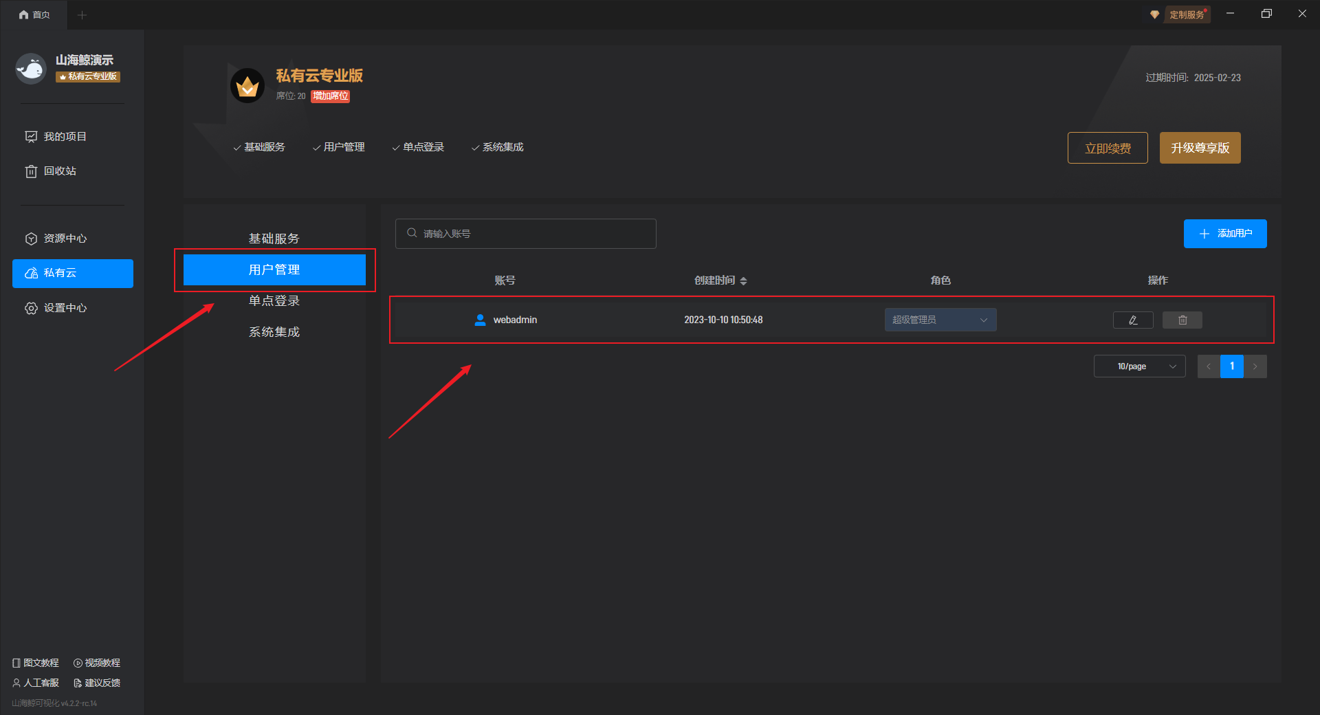 山海鲸 SaaS 服务功能目前只面向开通了山海鲸私有云服务的用户开放,不同的服务版本所支持创建的席位不同,如需增加更多 SaaS 席位,请联系山海鲸客服进行购买。