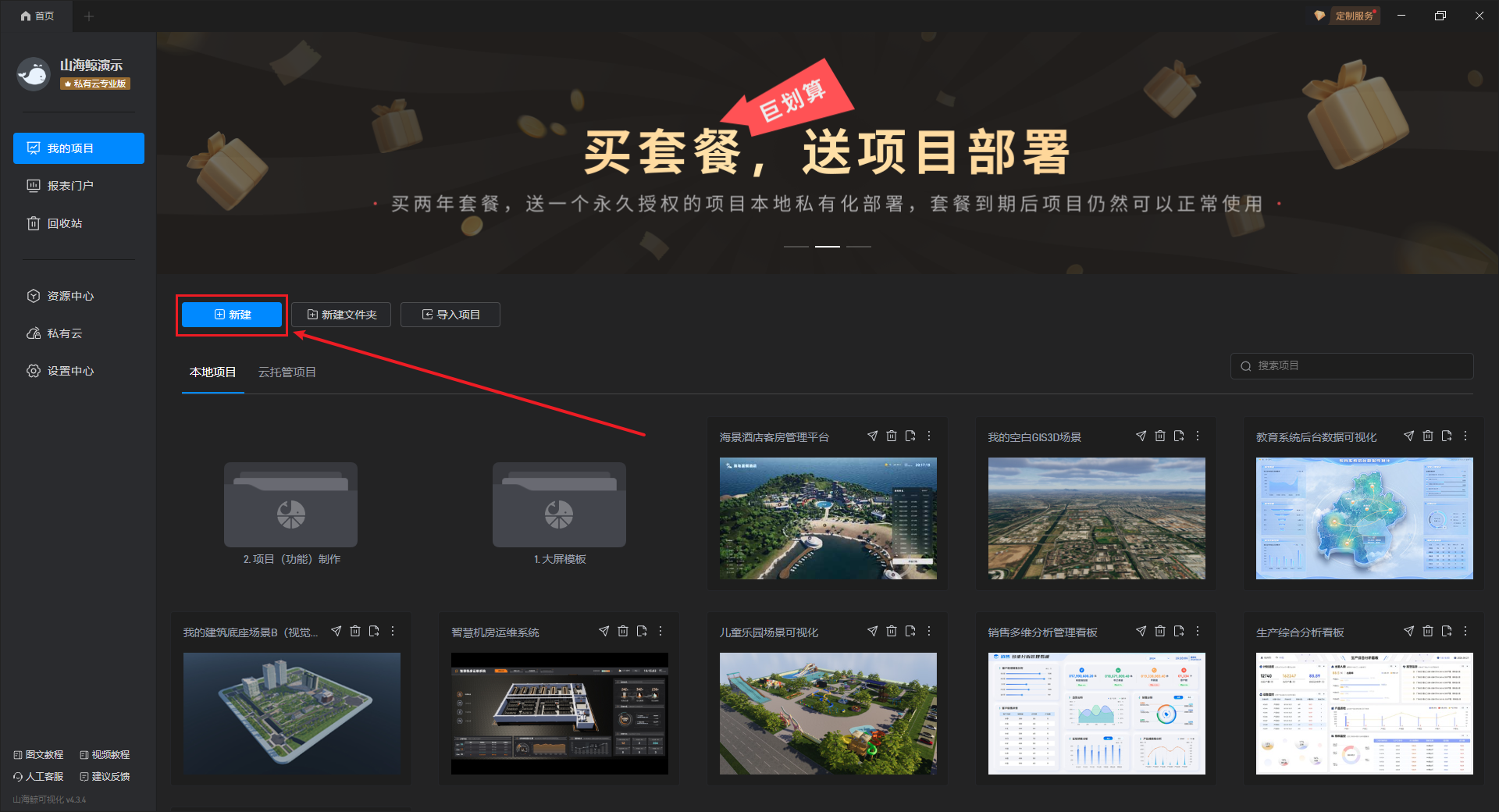 打开山海鲸可视化,点击左上角的“新建”按钮。
