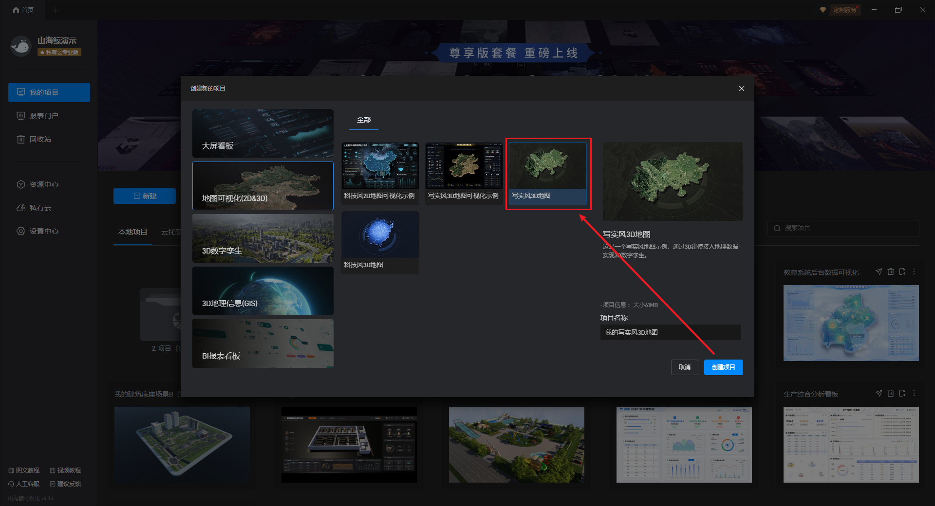 选择第二个“地图可视化(2D&3D)”栏目,在右边选中“写实风 3D 地图”,然后点击“创建项目”按钮。