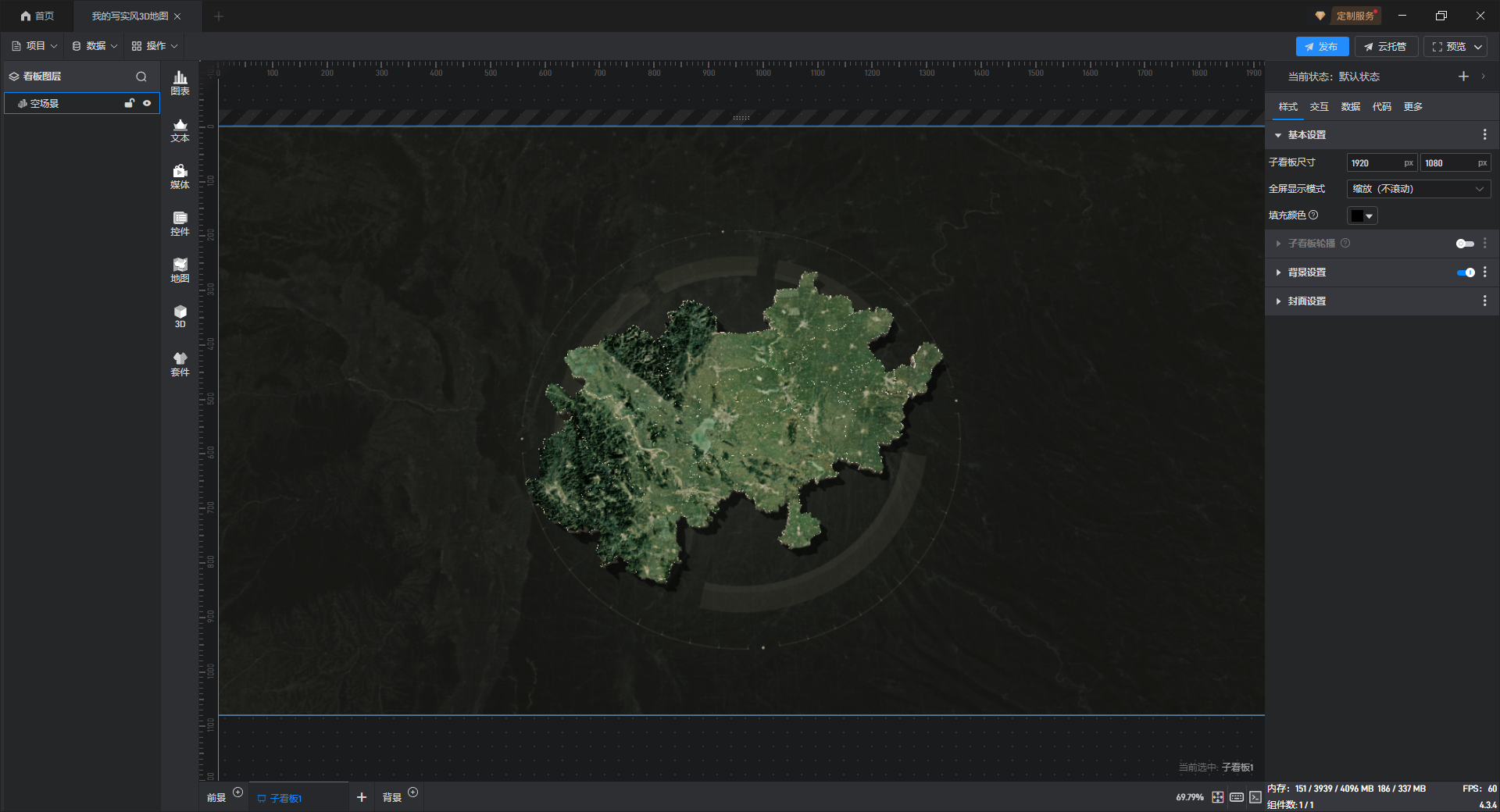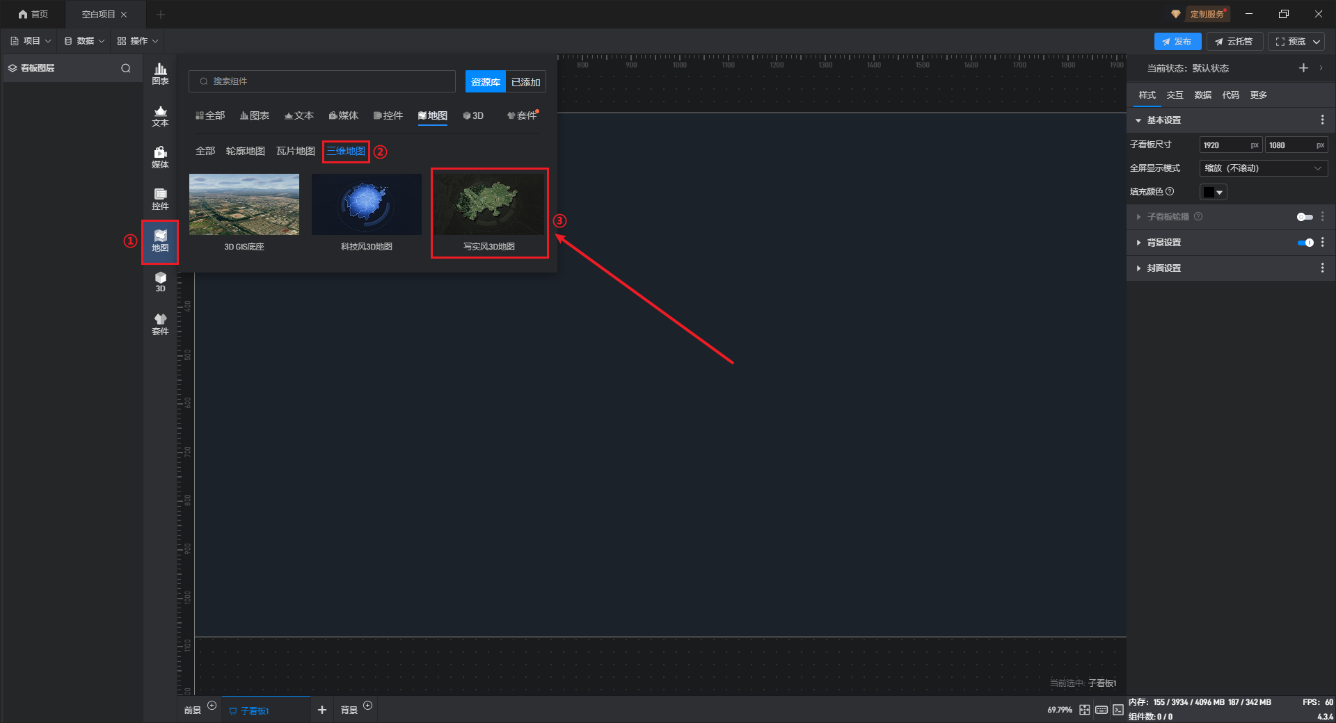 打开任意一个项目,在组件库中点击“地图-三维地图”,找到并添加写实风 3D 地图。