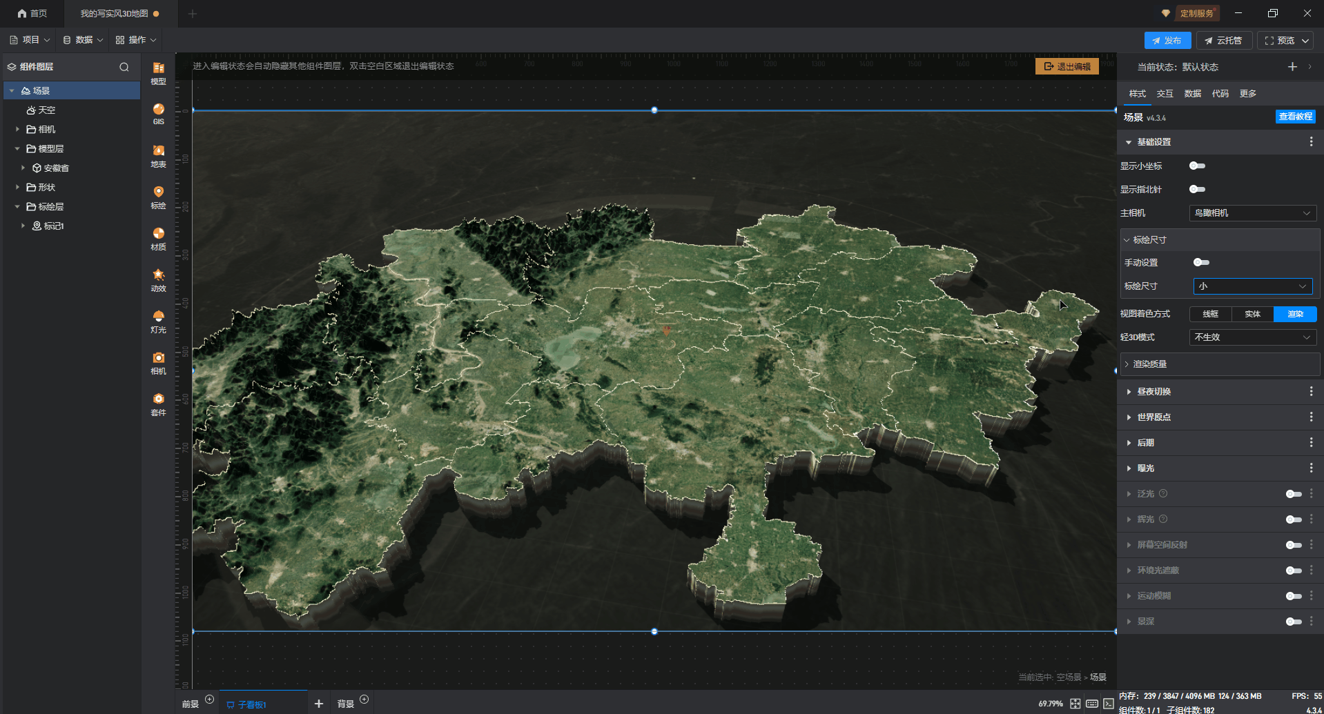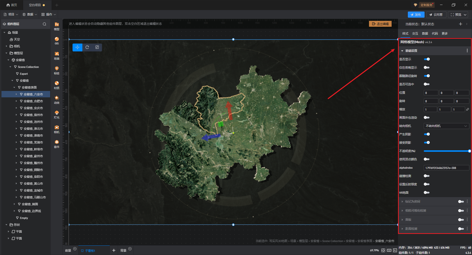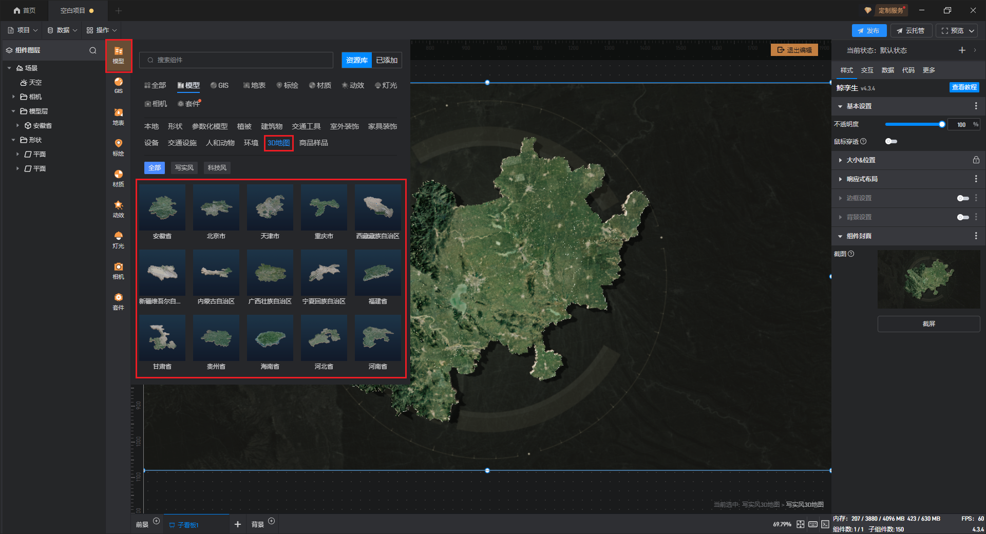 默认添加的写实风 3D 地图为安徽省地图,可以添加、替换其余省份的 3D 地图模型,具体操作如下: