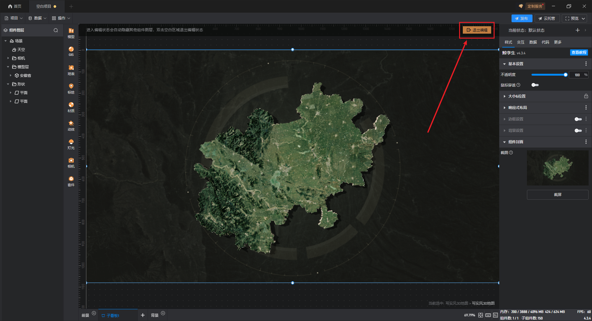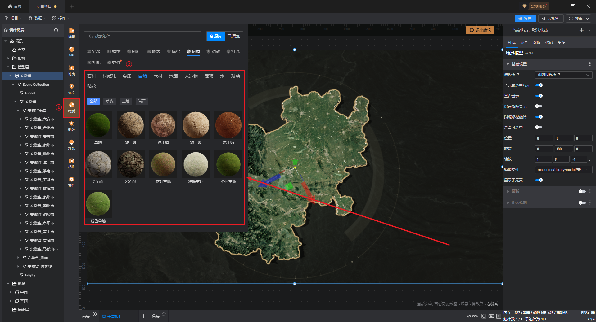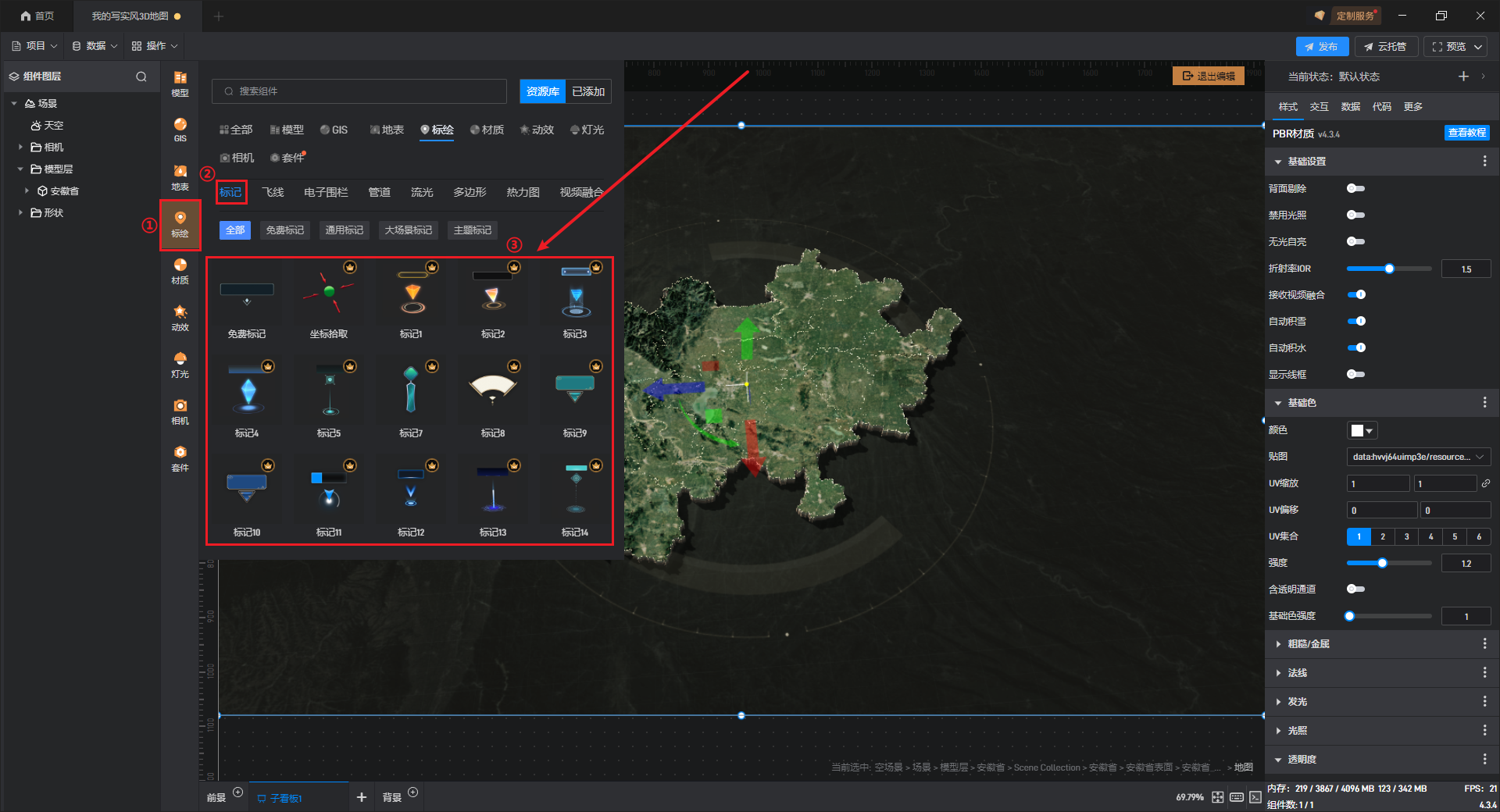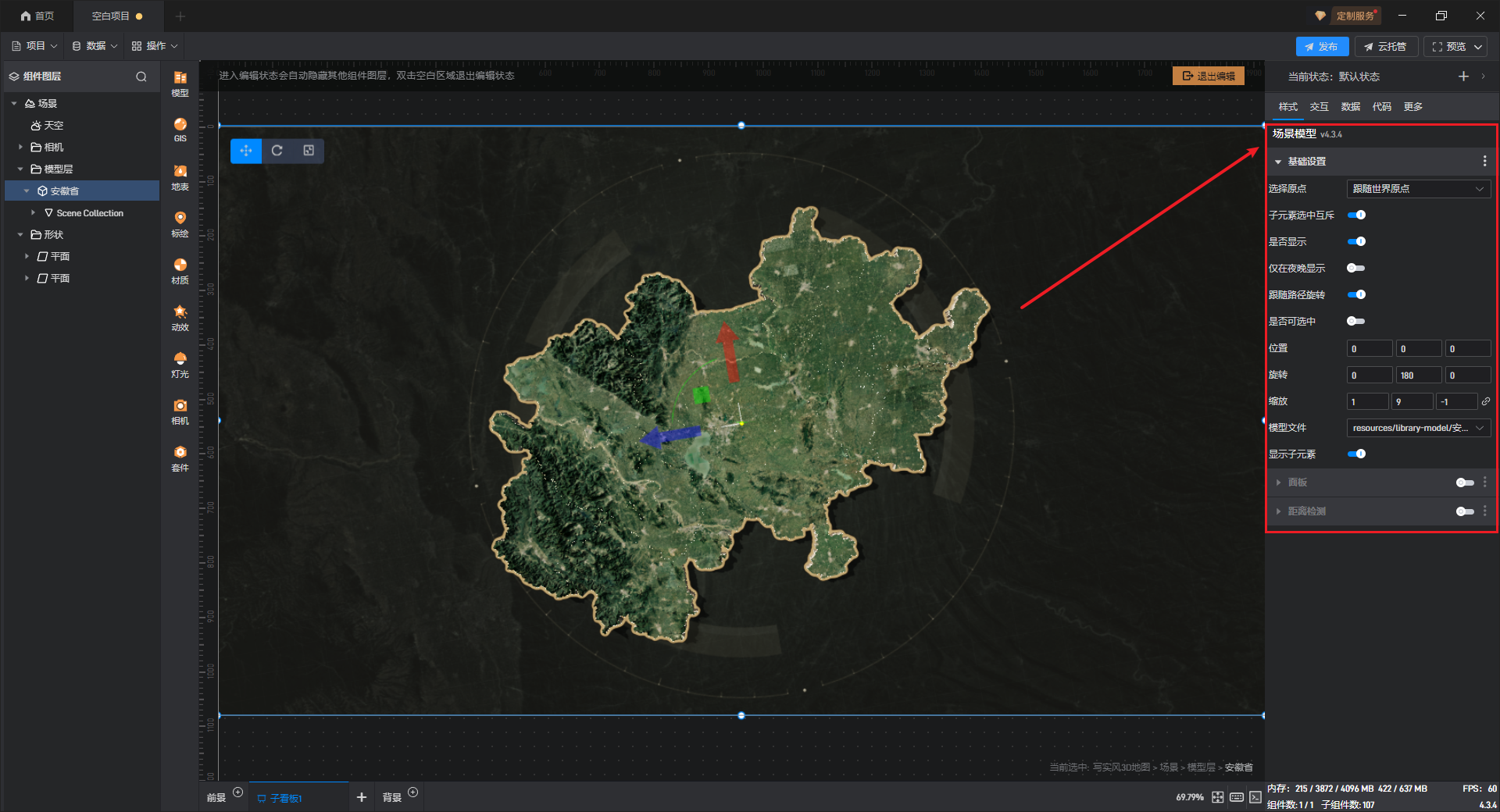 默认添加的写实风 3D 地图为安徽省地图,可以添加、替换其余省份的 3D 地图模型,具体操作如下: