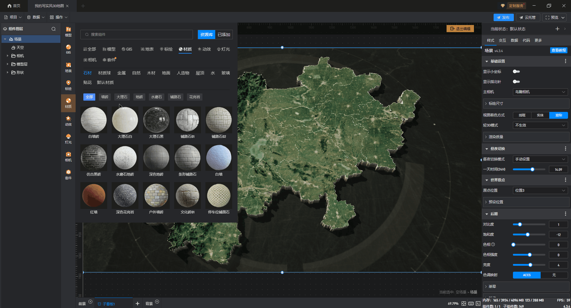 在组件库中点击材质,可以为地图替换各种类型的材质,如下图所示: