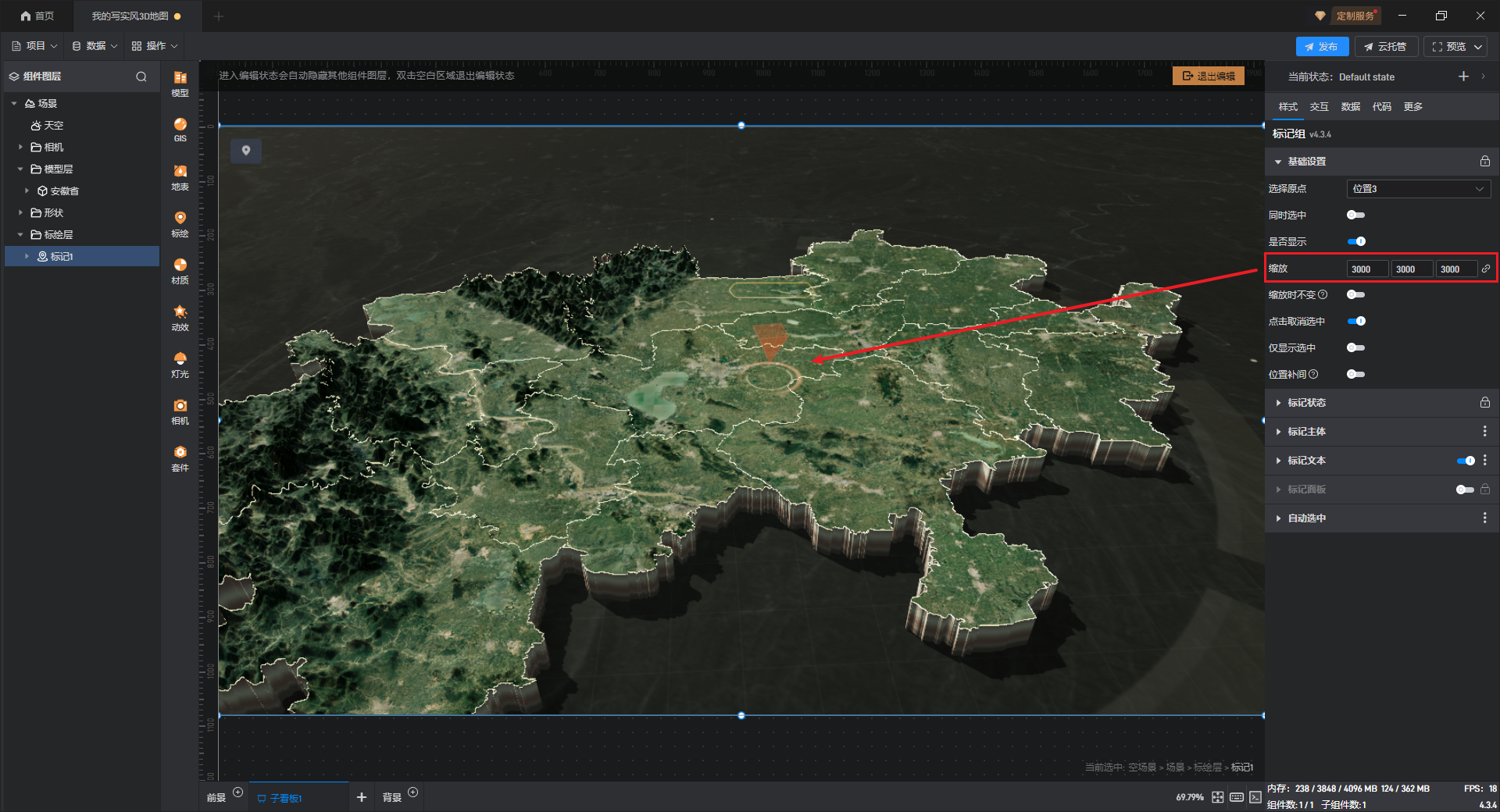 在场景图层中,我们也可以设置标记点的大小,在左侧点击组件图层中的“场景”,在右侧的样式设置中找到“标绘尺寸”,如下图所示: