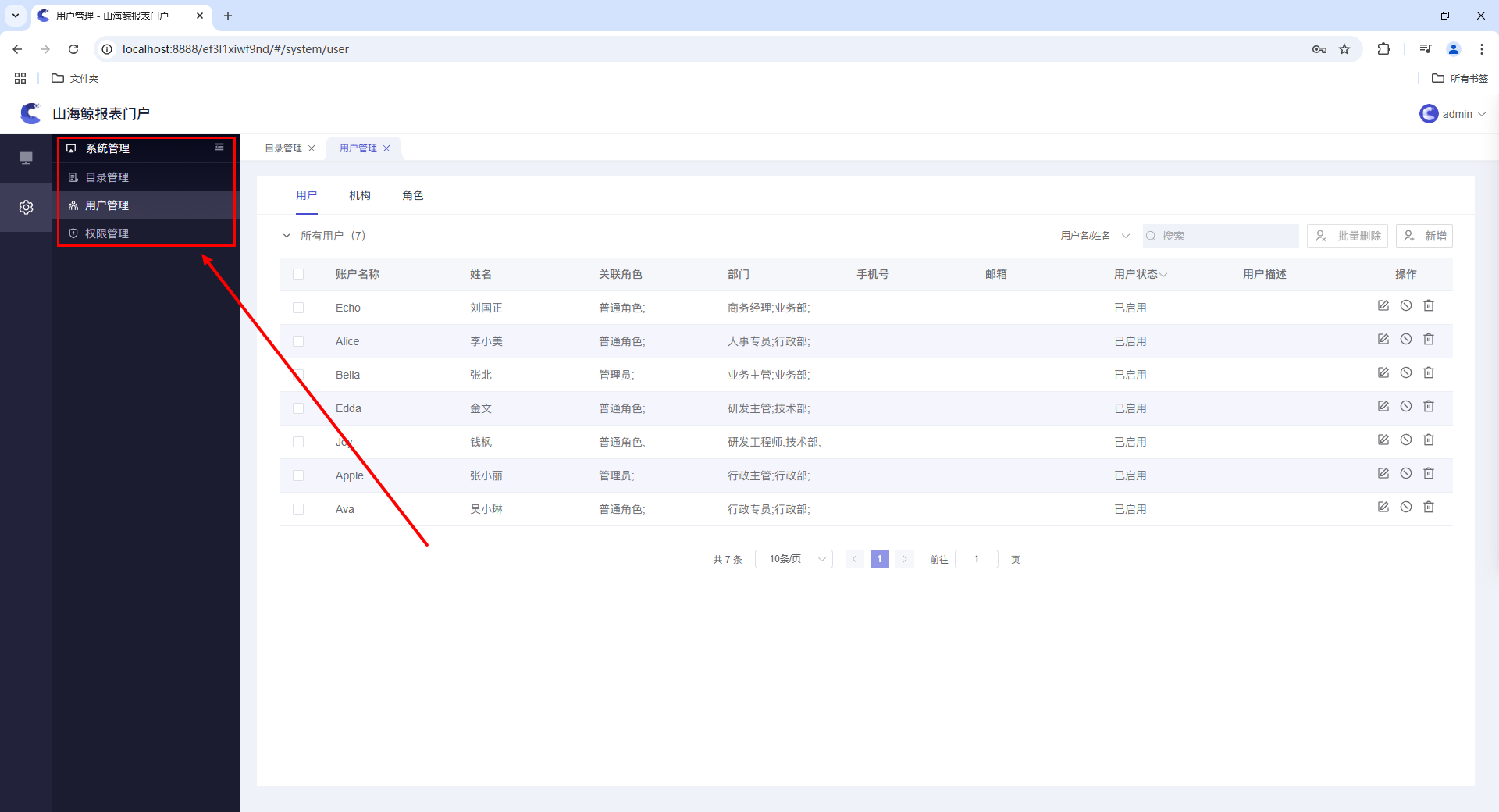 在左侧工具栏中可以切换到系统管理界面,在这里可以对报表的目录、用户、权限进行管理。