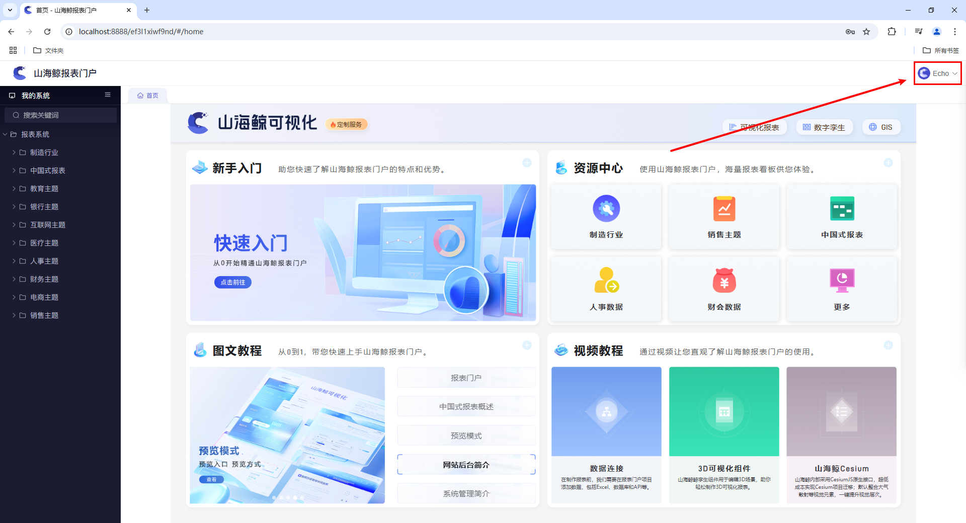 进入系统后,默认显示“我的系统”界面,首页会展示山海鲸报表的图文教程、视频教程和资源中心等,我们可以点击相应的链接进行查看,如下图所示: