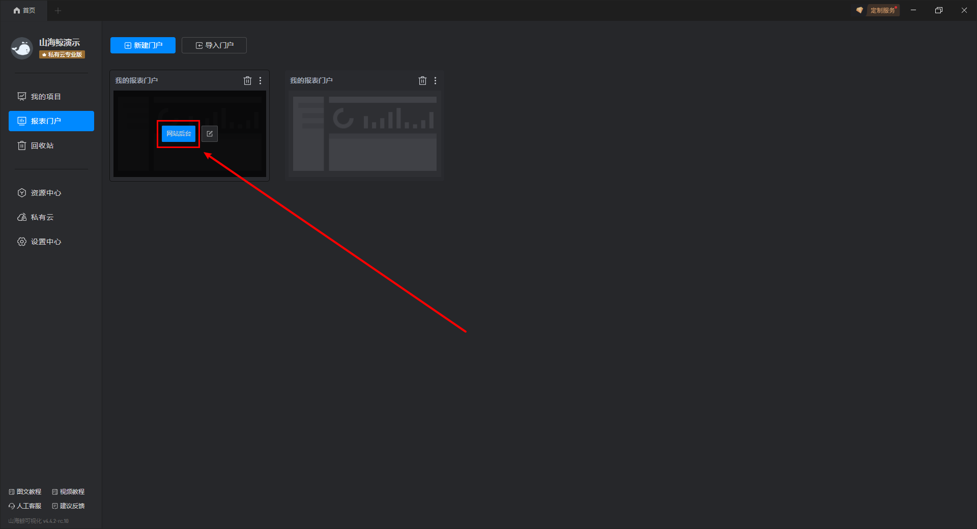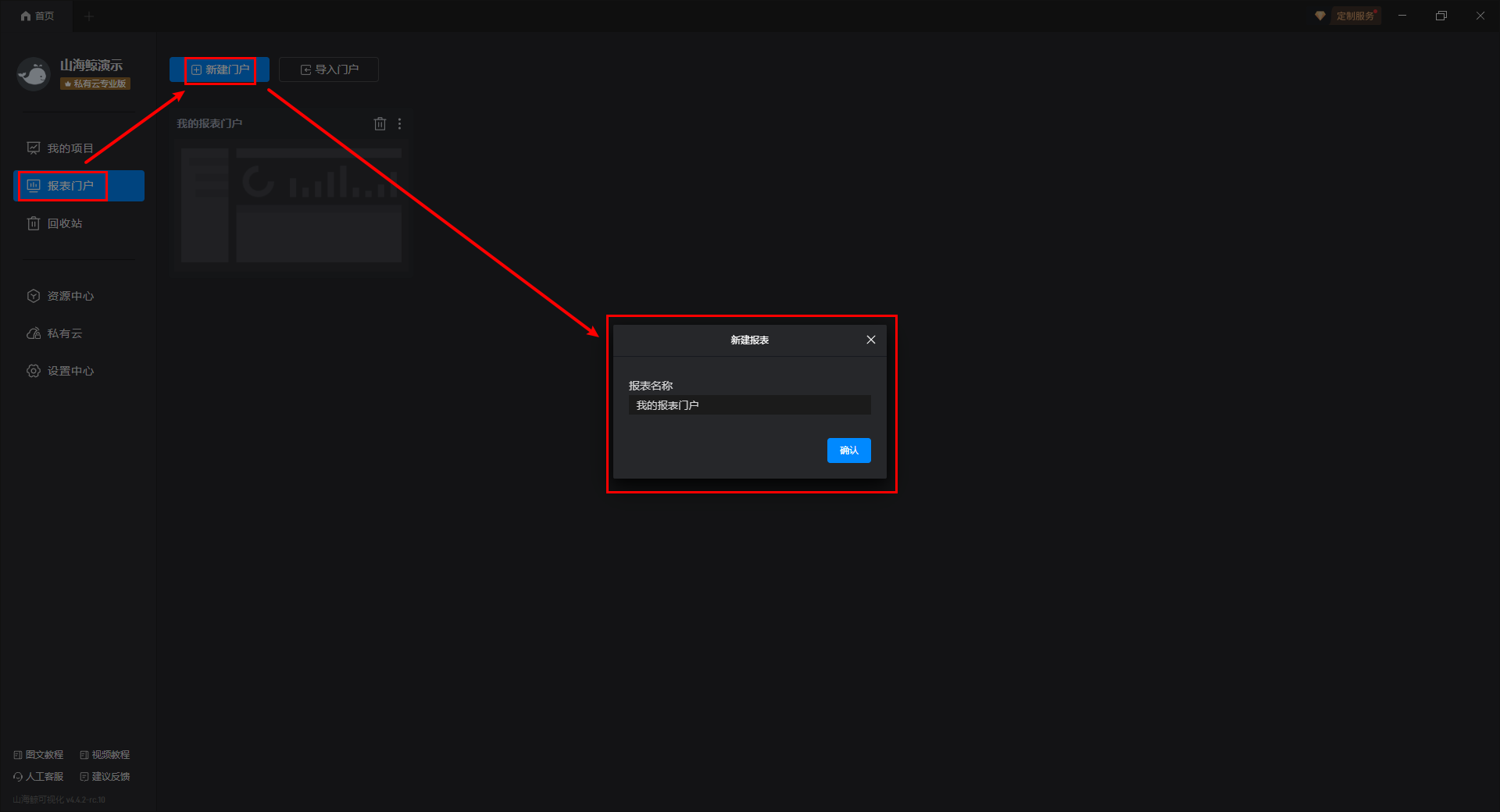 首先,我们需要在山海鲸可视化软件内找到“报表门户”,通过“新建门户”来创建一个报表。