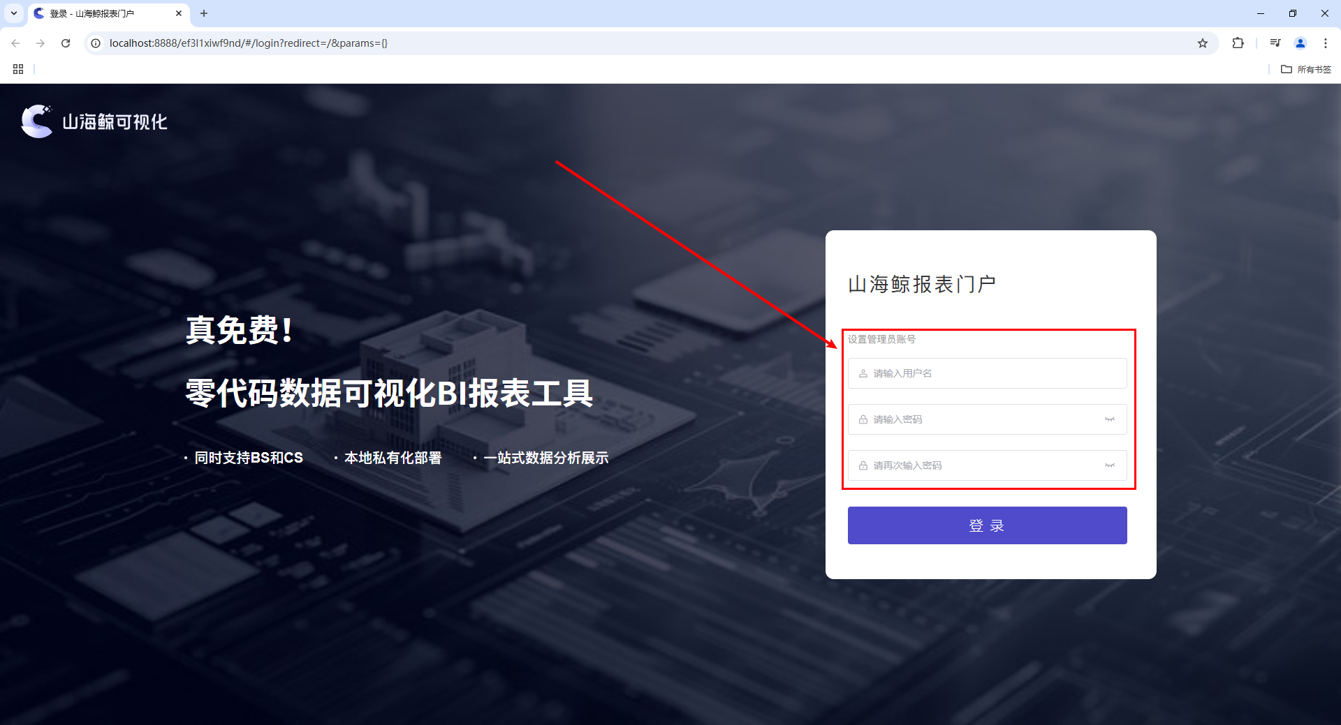 在初始化配置页面中设置管理员账号的用户名和密码,点击“登录”按钮即可进入系统。如下图所示: