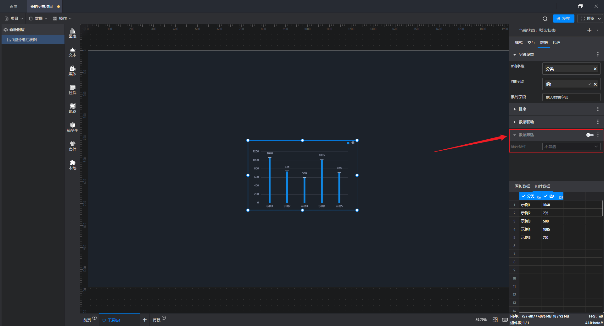 选中组件,可以在“数据”界面中找到“数据筛选”选项开关。
