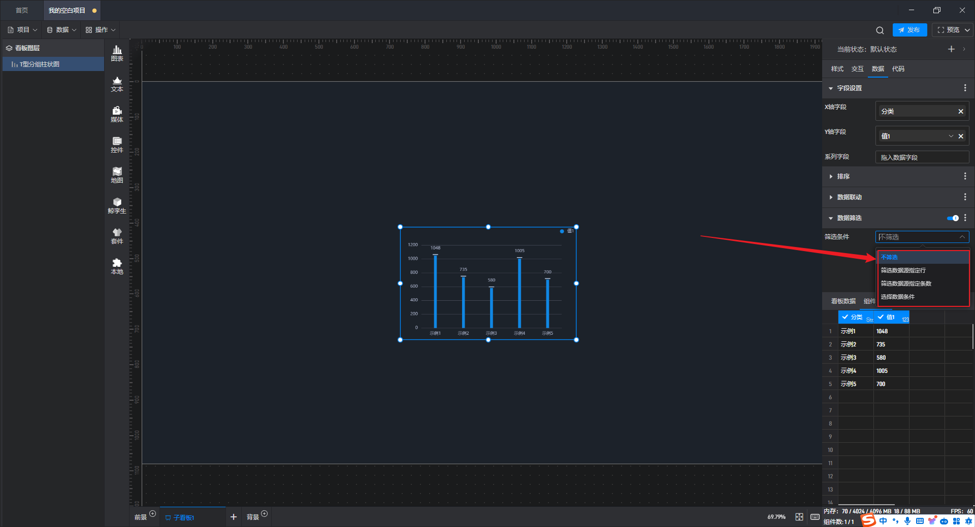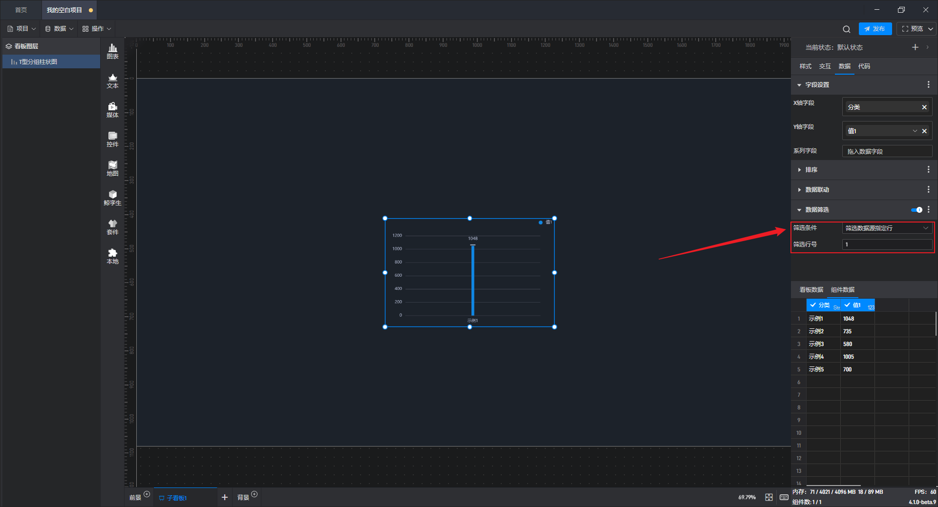 在某些情况下,我们需要组件只显示某些特定的数据,这时就需要用到“数据筛选”功能了。