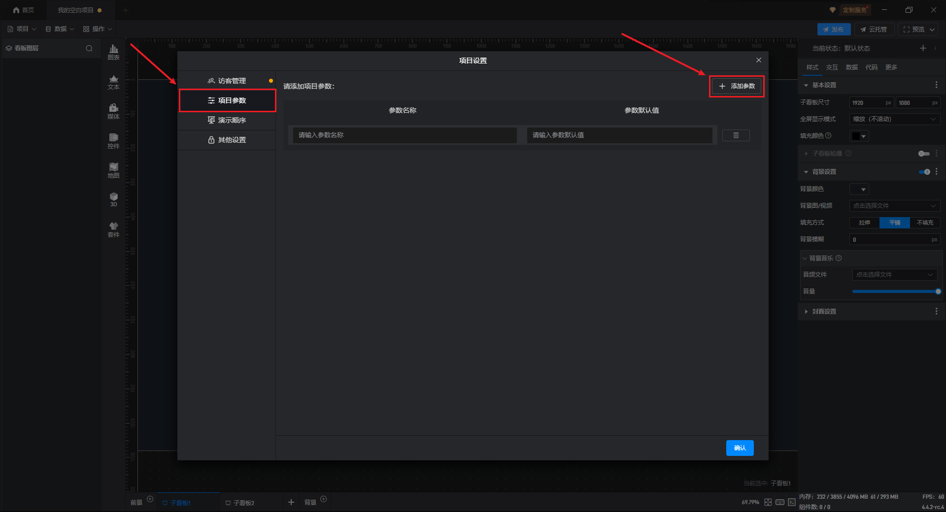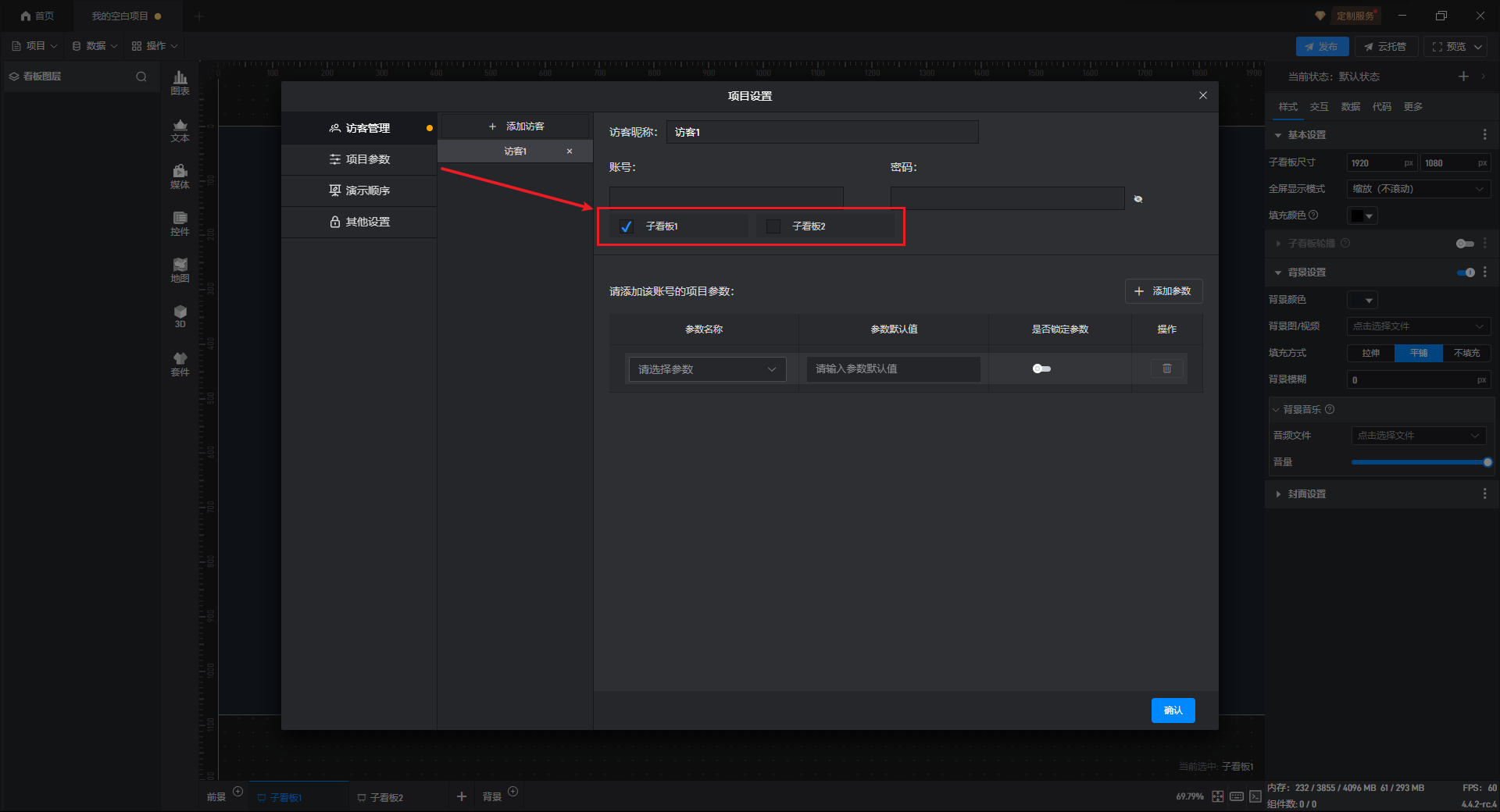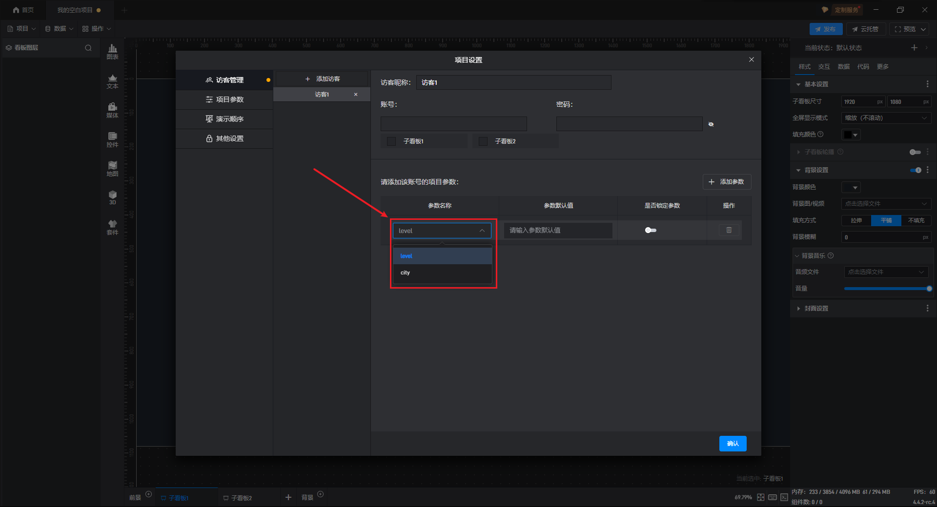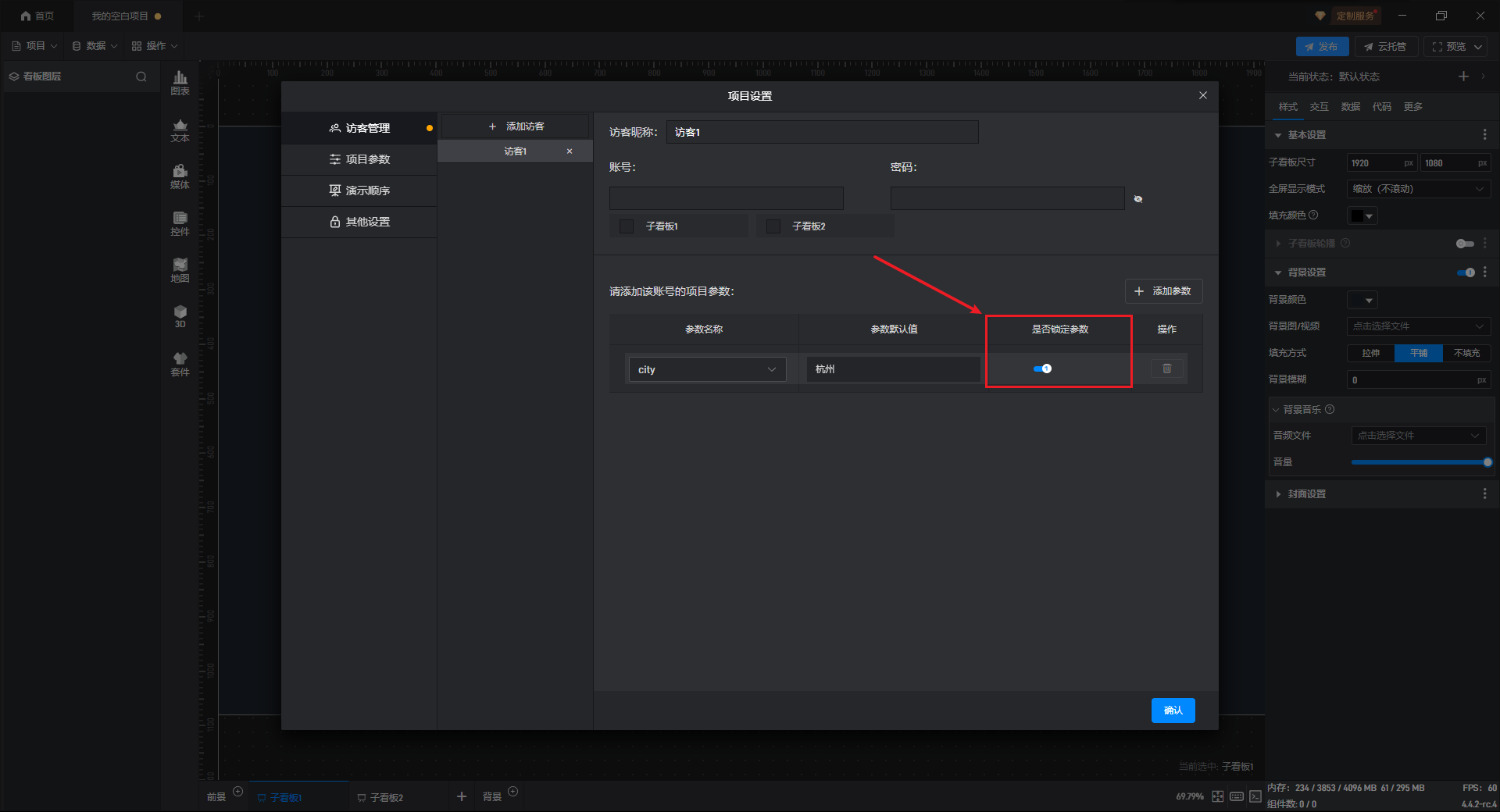 当我们给访客设置一个“项目参数”后,该访客在打开项目时,会自动将项目中的“项目参数”修改为这里设置的默认值,而无需通过参数传递来修改。
