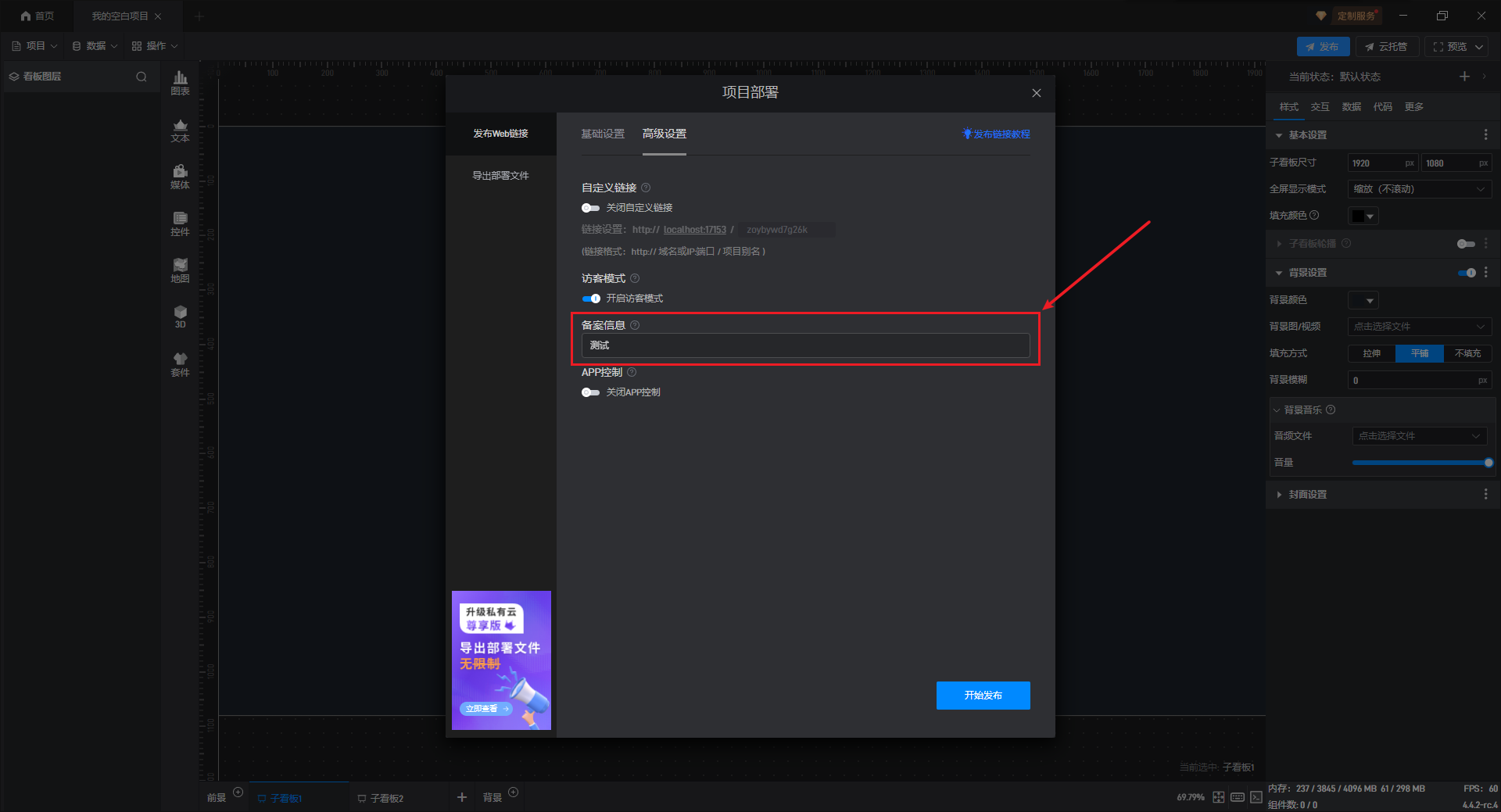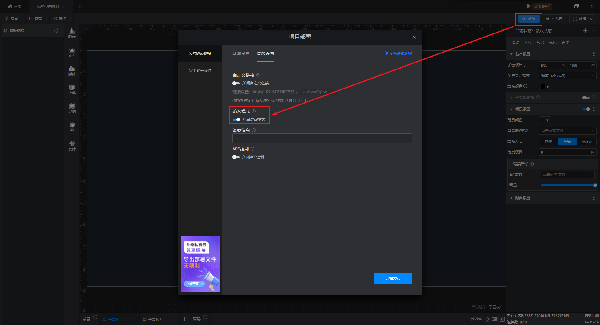 创建访客账户后,在“项目部署”弹窗中点击“发布 Web 链接”的“高级设置”开启“访客模式”,点击“开始发布”即可通过访客身份访问项目。