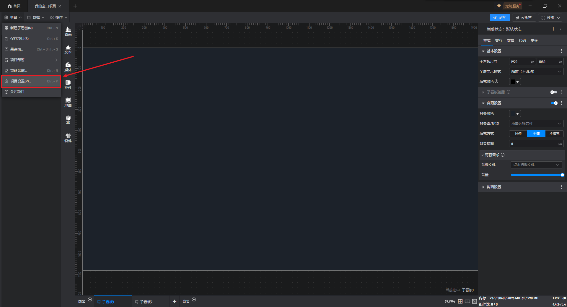 在项目编辑界面点击“项目”菜单,打开“项目设置”。
