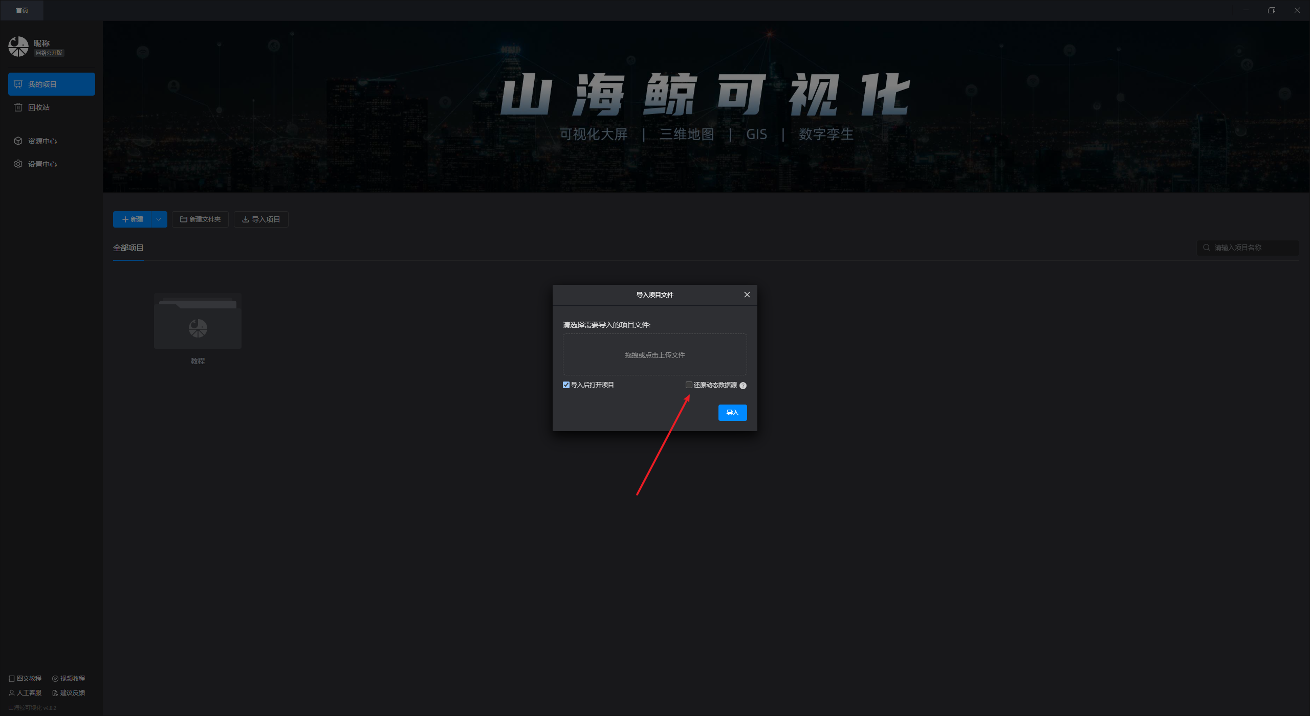 项目文件只能通过山海鲸可视化导入,在软件首页“我的项目”界面,点击下方的“导入项目”可以打开本地保存的项目文件,如下图所示: