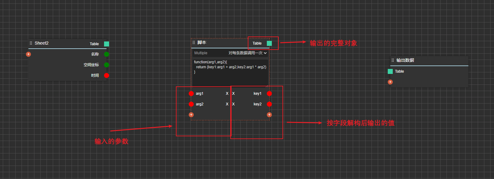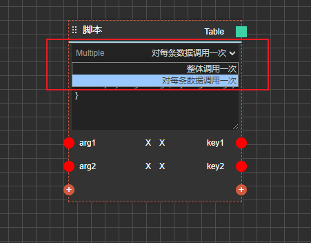 每条数据调用一次:每一行数据都会单独进脚本的回调,一共进入两次,arg1 分别为 {name:a, value:1}和{name:b, value:2}