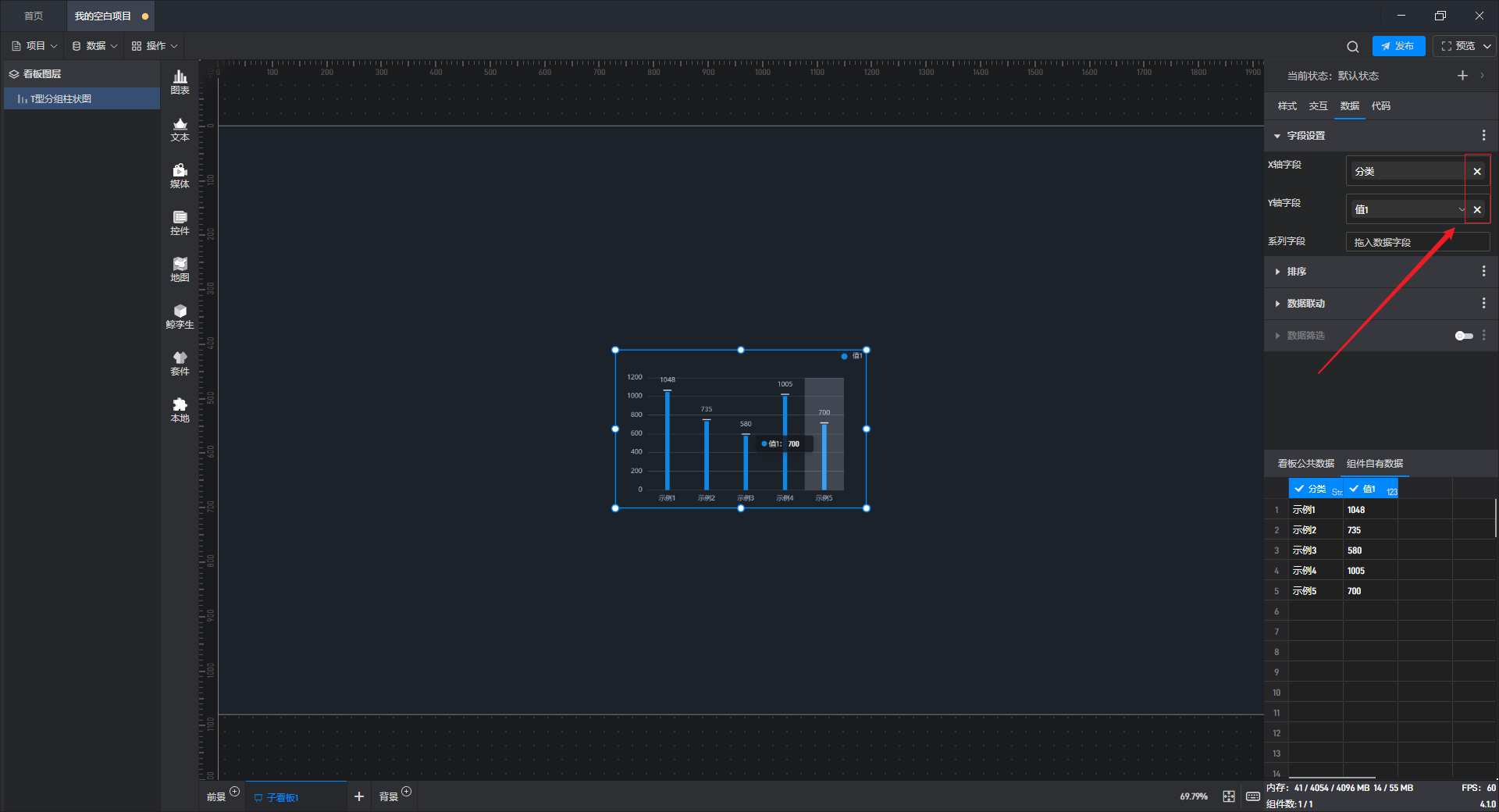 在给组件添加数据数据时,方法(1)有可能出现识别结果不满足需求的情况。如果在拖动数据之后想要进行数据的修改,可以点击“x”删除数据。