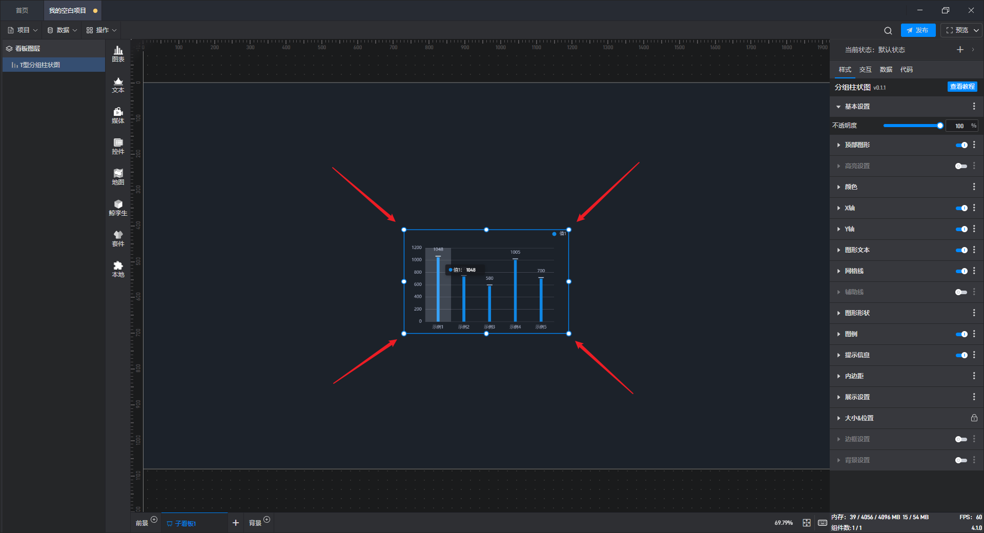 点击选中组件可以使组件进行移动,将鼠标移至组件四周的边框可以对齐进行拖拽放大或缩小,按住“Shift”键可以在拖拽时让组件保持长宽比例。