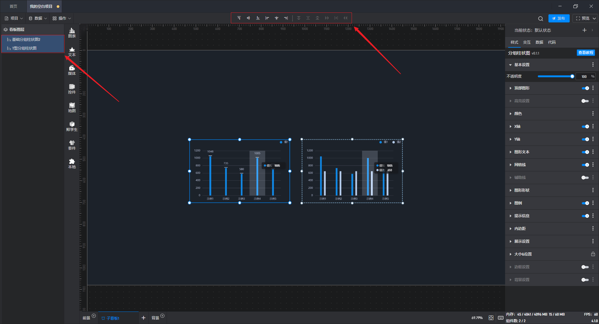 选中多个组件时,可以通过操作菜单进行对齐和排列分布,也可以通过工具条进行快捷设置。