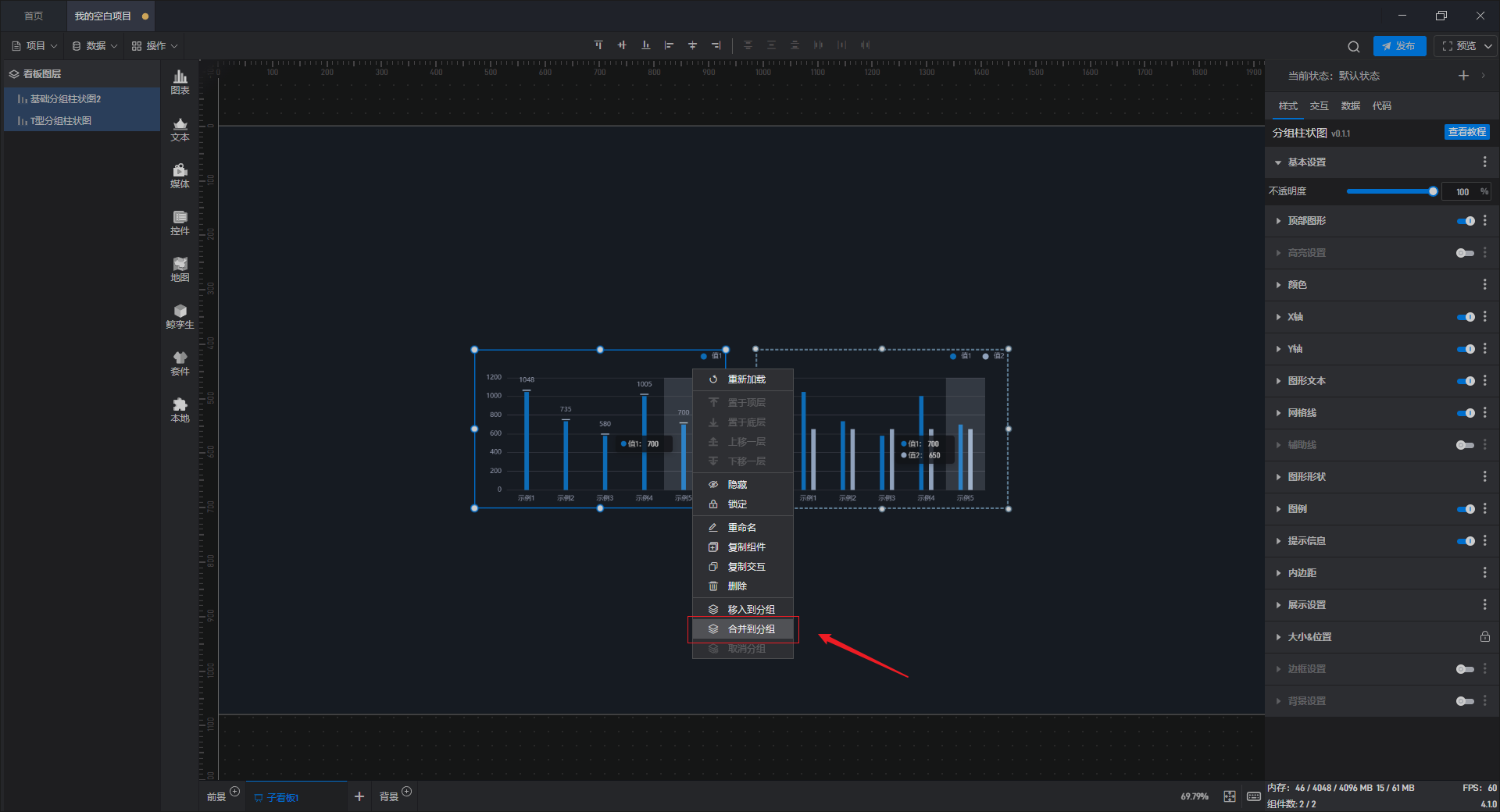 右键点击组件,选择“合并到分组”,选择想要合并的分组面板,该组件就会合并到对应的分组面板中。