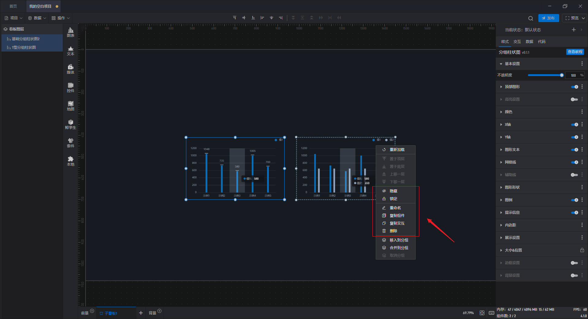 右击组件还可以对其进行隐藏、锁定、复制和删除。