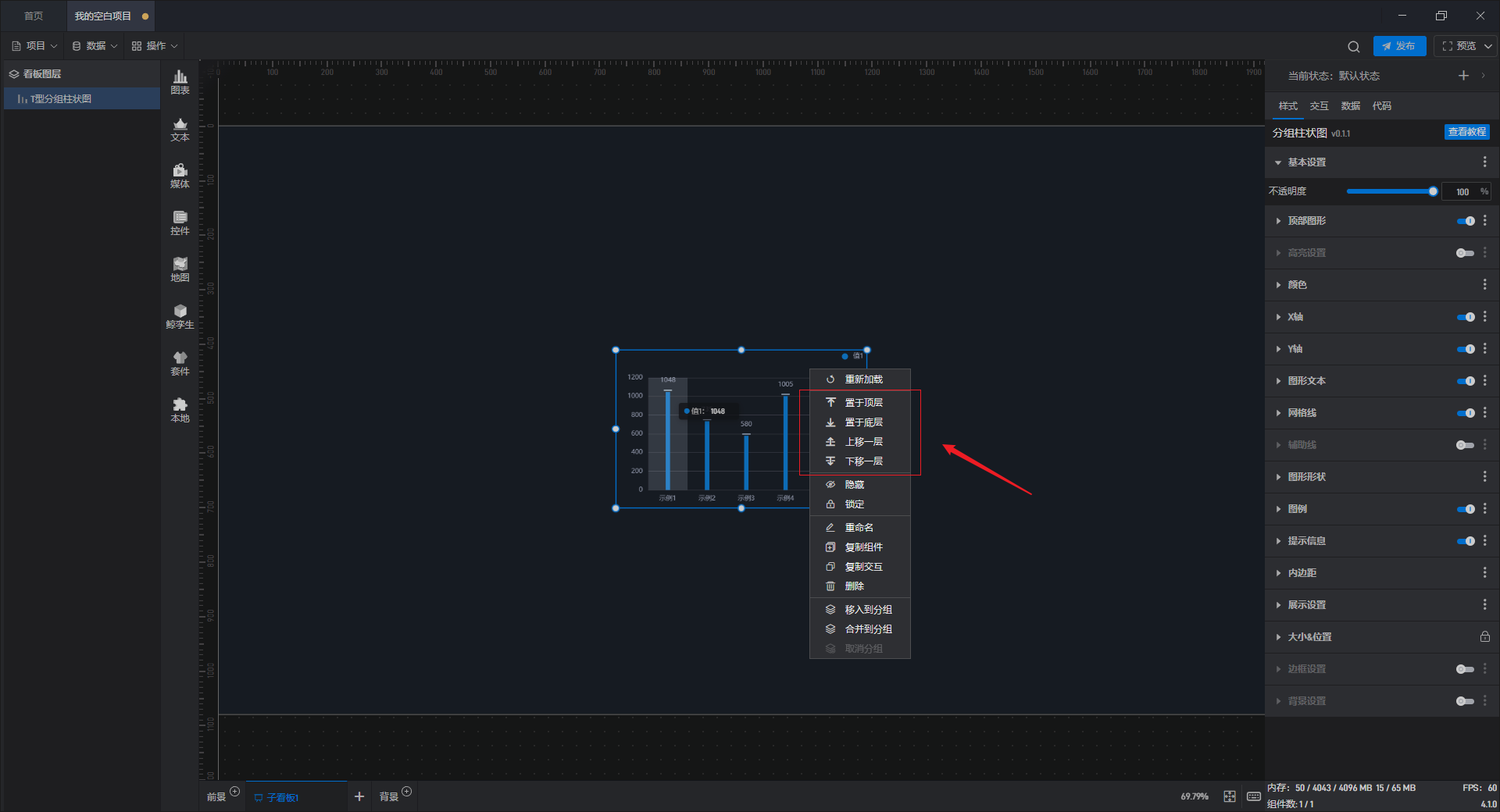 右击组件可以对其进行图层位置的设置,包括:置于顶层、置于底层、上移一层、下移一层。