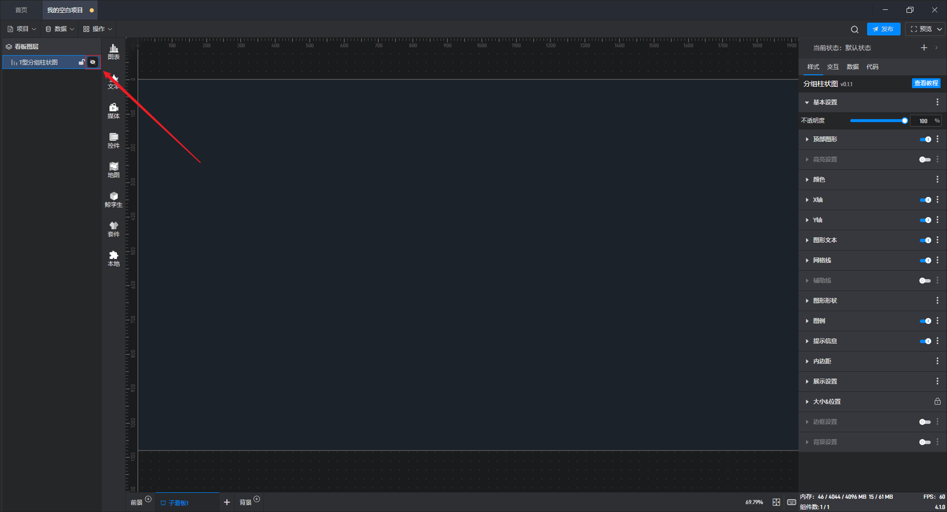 如果选择了“隐藏”操作,则该组件会被隐藏,如果需要恢复显示,需要到左侧“看板图层”列表中点击进行显示。(选中组件时,左侧图层列表中该组件对应的图层会高亮显示)