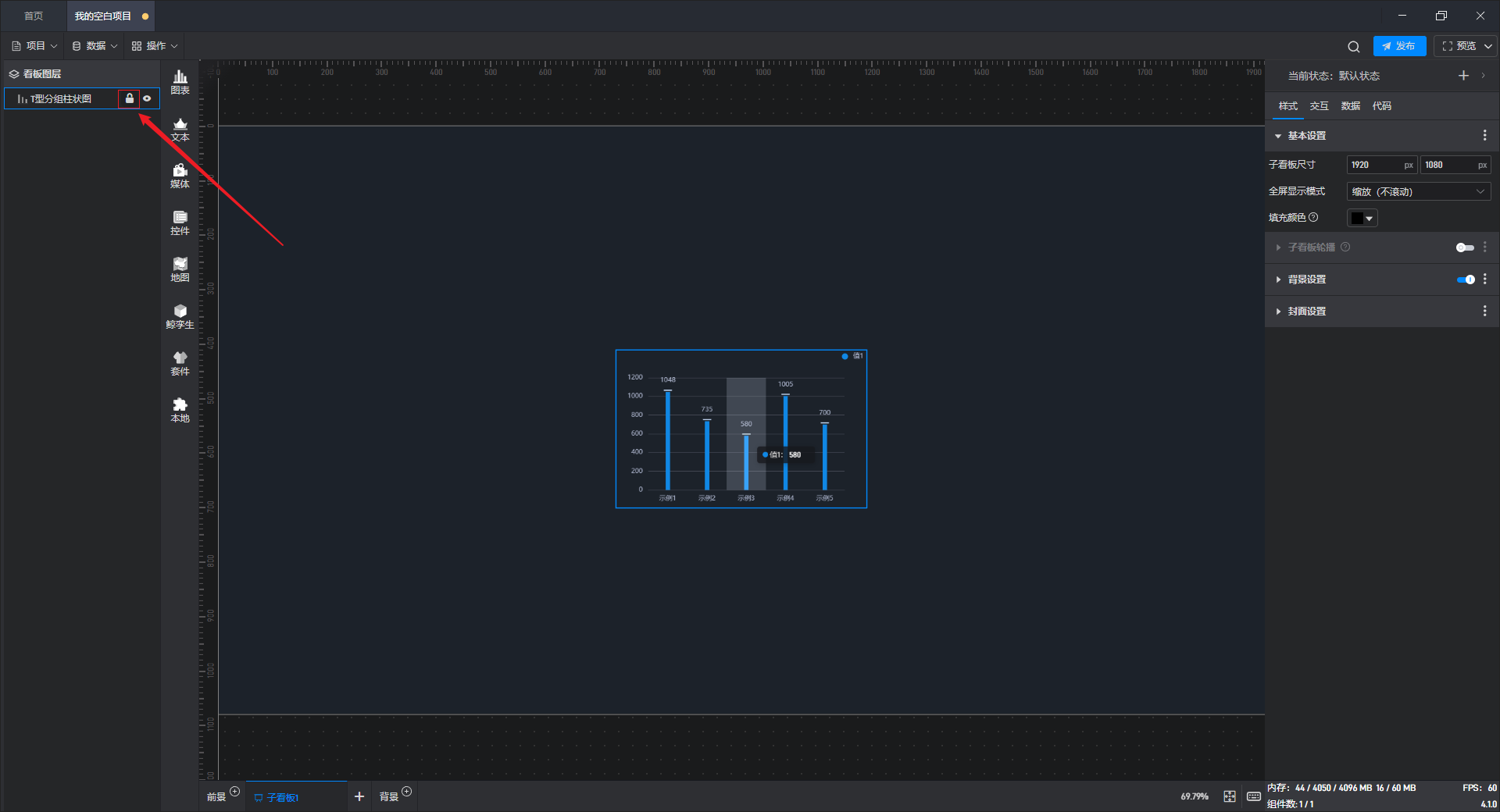 如果选择“锁定”操作,则当前组件会被锁定,此时无法被选中或操作。如果要释放锁定,同样需要到左侧“看板图层”列表中点击进行解锁。