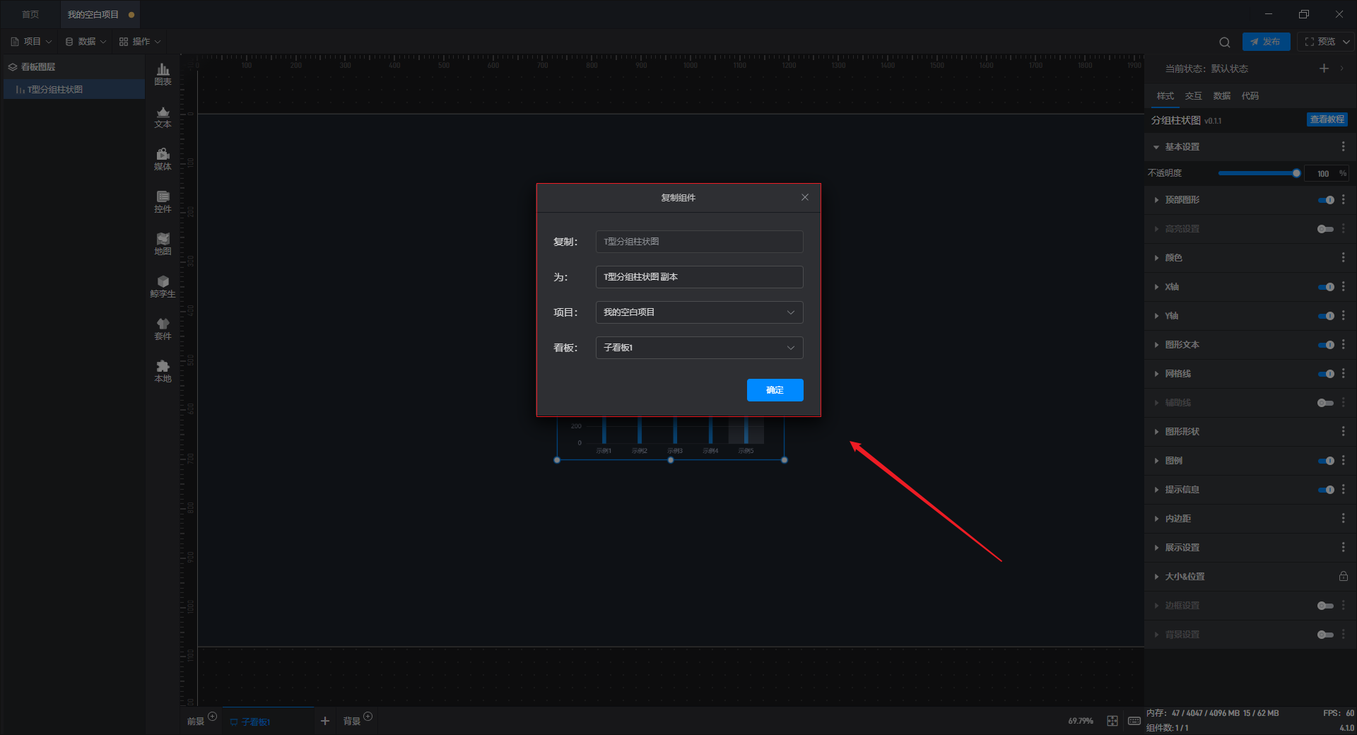 如果选择“复制”操作,则会弹出“复制组件”弹窗,在窗口中可以将复制后的组件进行设置,新组件会保持复制组件相同的数据和样式。