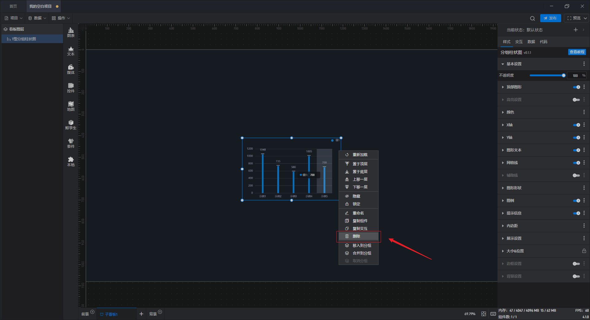 如果选择“删除”操作,则会将当前组件删除,您也可以在选中组件时按“Delete”键进行删除。