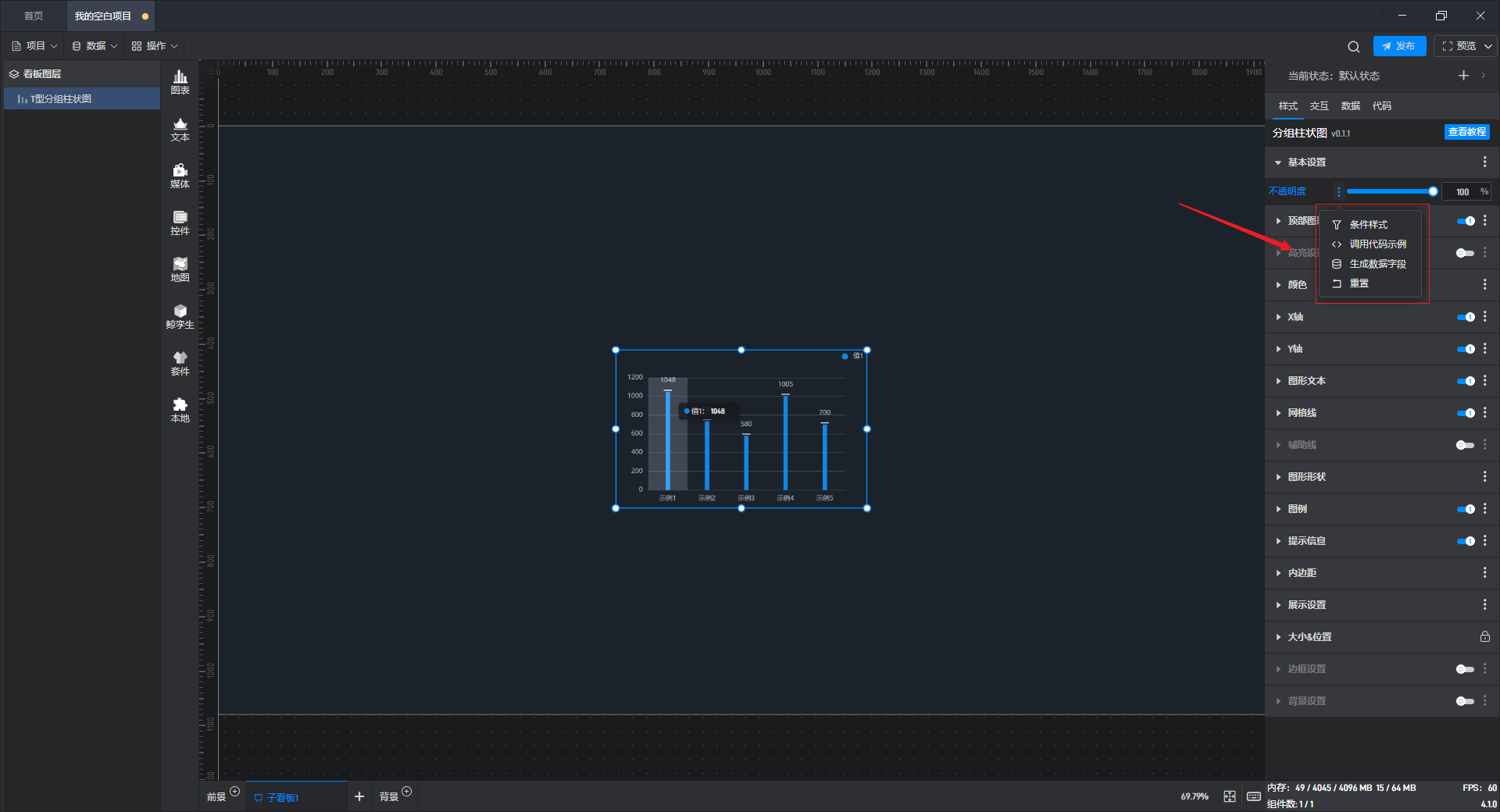 组件的每个样式属性都可以打开一个“扩展设置”菜单,将鼠标移至属性名称的右侧后即可看到,菜单共包含四个选项:“条件样式”、“调用代码示例”、“生成数据字段”和“重置”。