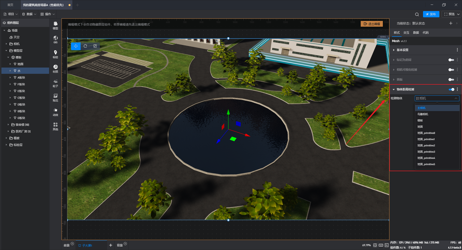 | 是否可选中 | 即鼠标点击该模型时的选中效果,按钮开启后可设置选中是否高亮以及高亮颜色。 |
