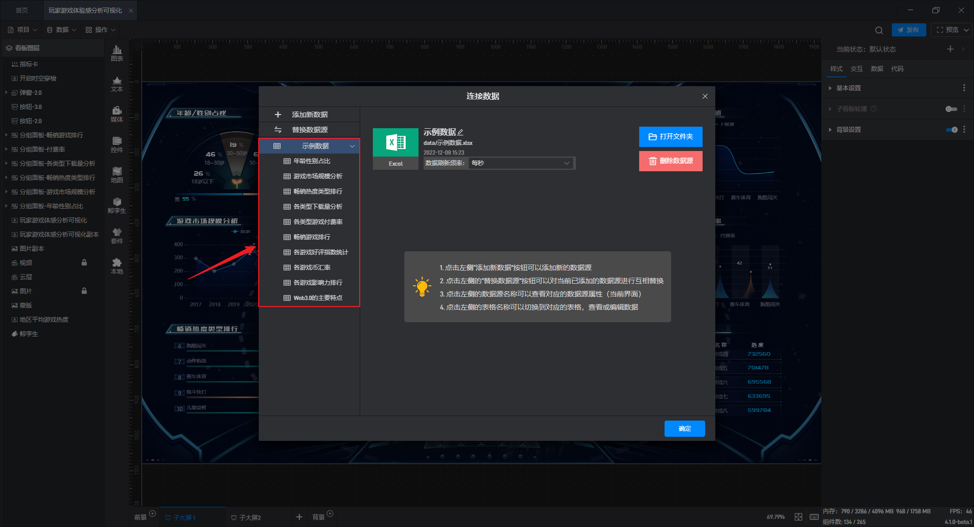 修改模板自带的数据有两种方案,第一种是直接在数据源上做修改,另一种是直接替换数据源。本文主要介绍直接在数据源上做修改的方法,关于直接替换数据源的方法请参考教程:替换数据。