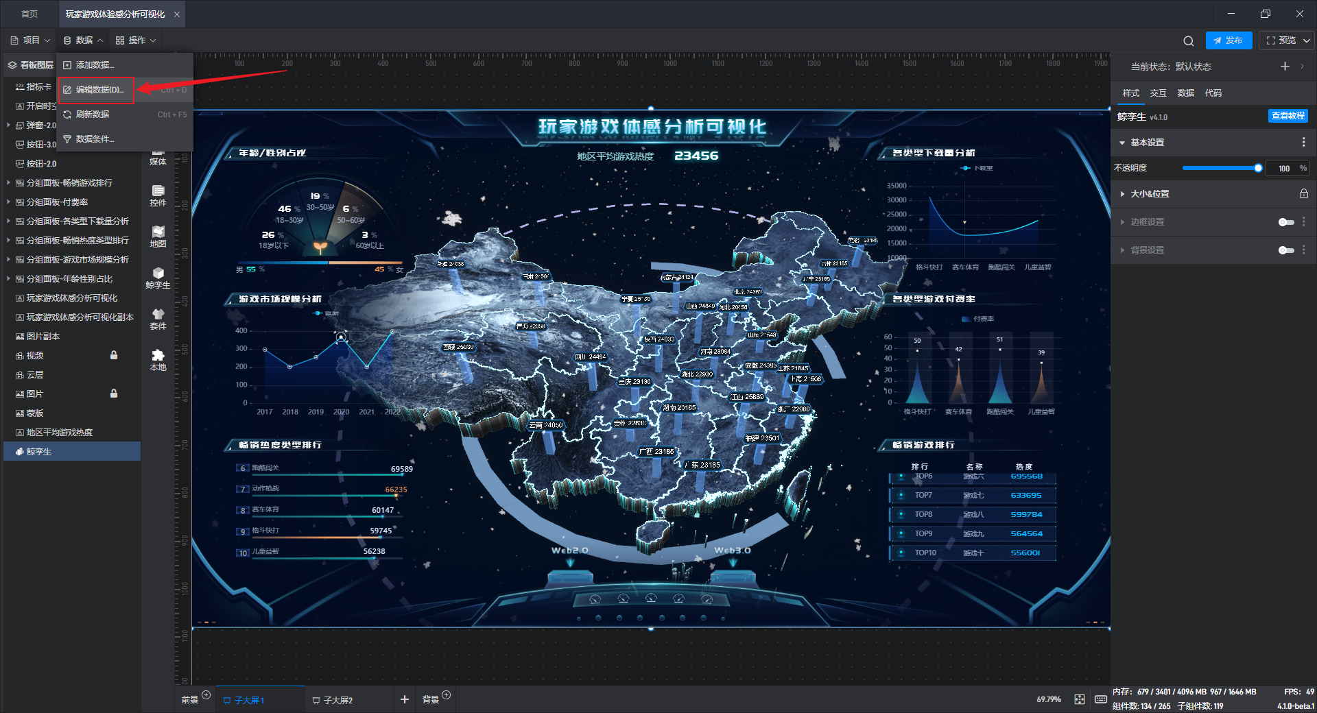 在大屏编辑界面,点击“数据”下拉菜单中的“编辑数据”。