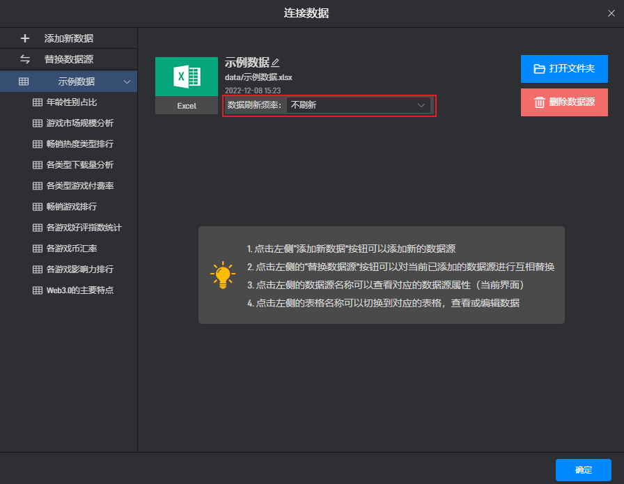 我们可以也在此设置数据源的自动刷新频率,这里设置的数据源刷新频率可以应用到整个数据源内的所有子表格中,关于数据刷新请参考该教程:刷新数据。
