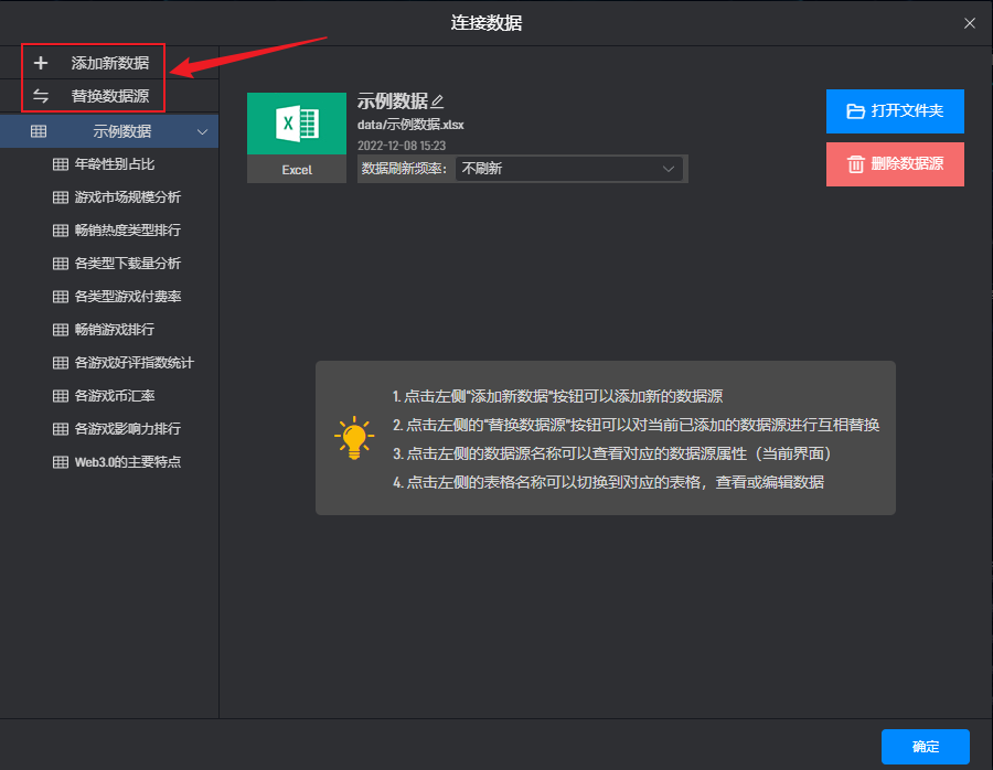 点击“添加数据源”可以继续添加新的数据源,关于添加数据源请参考教程:添加数据;点击“替换数据源”可以对当前项目中已经添加的所有数据源进行替换处理,关于替换数据源请参考教程:替换数据。